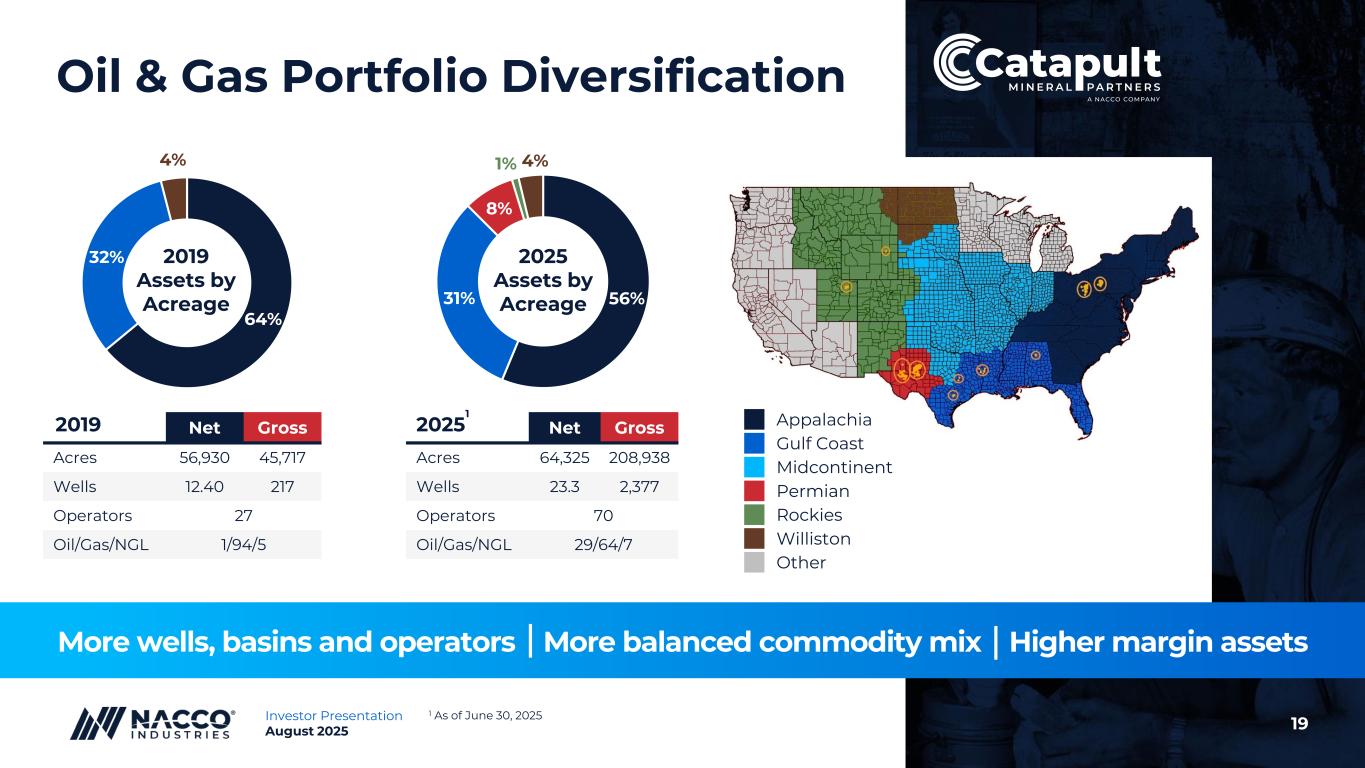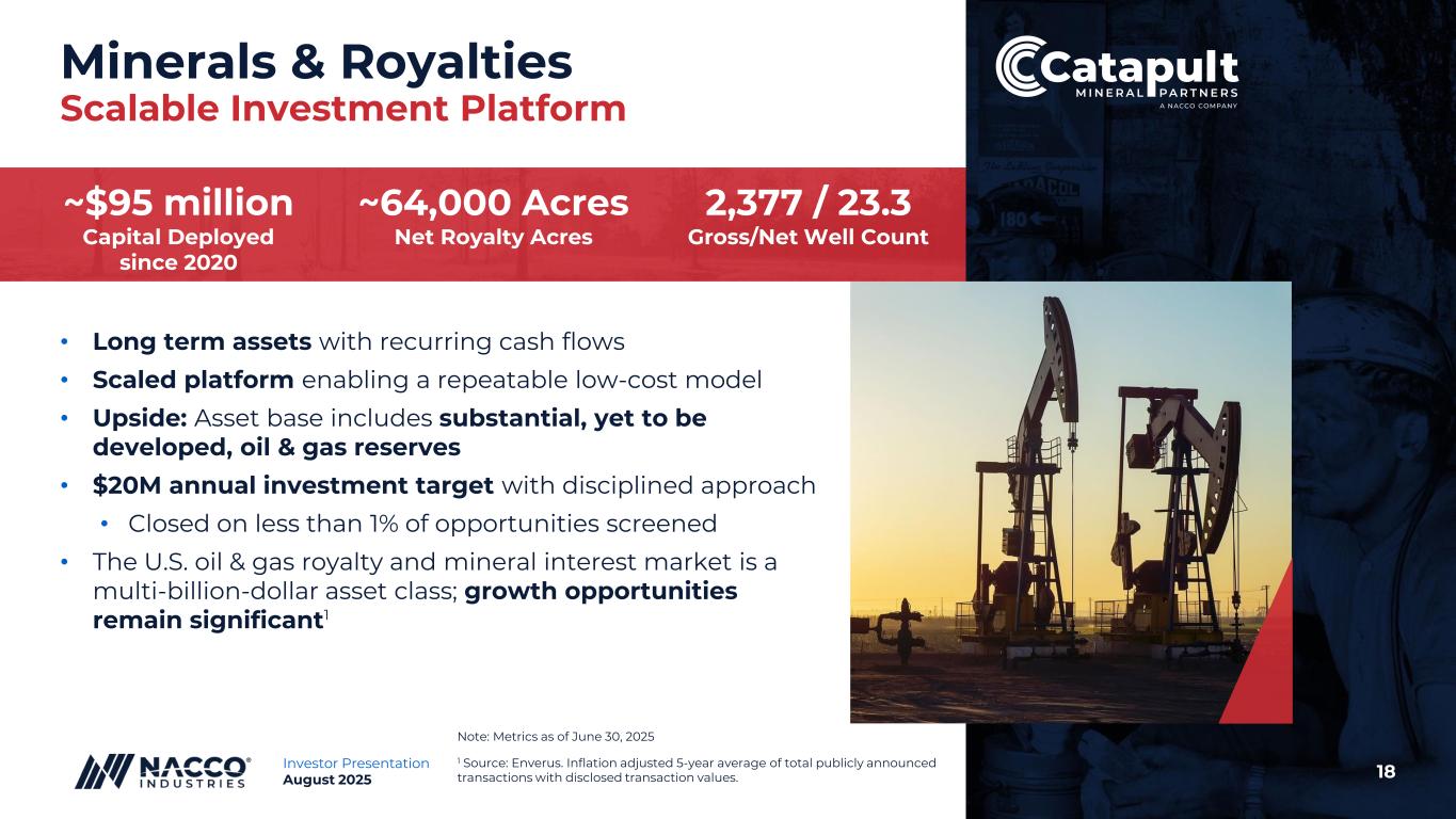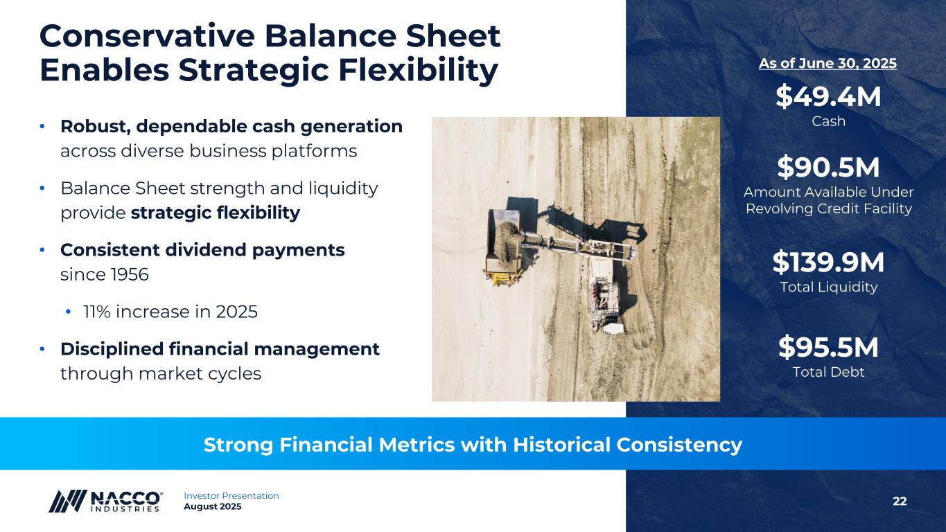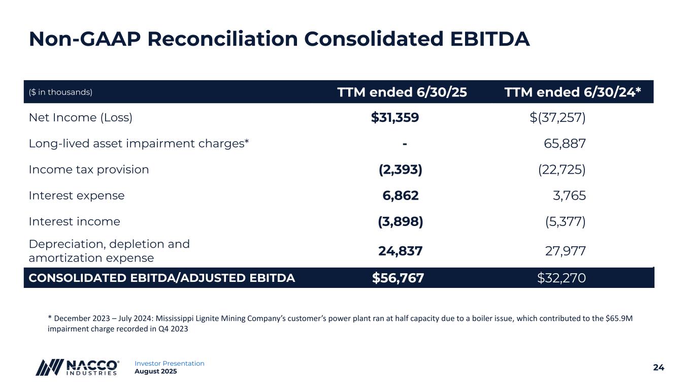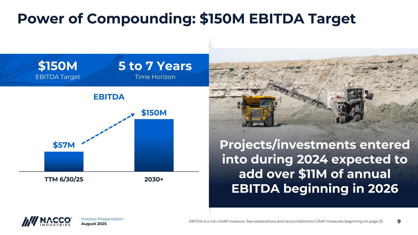 2Investor Presentation August 2025 Forward Looking Information Disclosures This presentation includes forward-looking statements subject to important risks and uncertainties. It may also contain financial measures that are not in conformance with accounting principles generally accepted in the United States of America (GAAP). The forward-looking statements included are within the meaning of Section 27A of the Securities Act of 1933, as amended, and Section 21E of the Securities Exchange Act of 1934, as amended. Any and all statements regarding the Company’s expected future financial position, results of operations, cash flows, business strategy, projected costs, capital expenditures, services, competitive positions, growth opportunities, plans, goals and objectives of management for future operations, as well as statements that include words such as “anticipate,” “if,” “believe,” “plan,” “estimate,” “expect,” “intend,” “may,” “could,” “should,” “will,” and other similar expressions are forward-looking statements. Forward-looking Information noted in the following slides was effective as of August 25, 2025. Such statements are inherently uncertain, and readers must recognize that actual results may differ materially from the expectations of NACCO Industries’ management. The Company does not undertake a duty to update such forward-looking statements. Among the factors that could cause plans, actions and results to differ materially from current expectations are, without limitation: (1) a significant reduction in demand by the Company's customers, (2) weather conditions, extended power plant outages, liquidity events or other events that would change the level of customers' coal or aggregates requirements, (3) changes to or termination of customer or other third-party contracts, or a customer or other third party default under a contract, (4) changes in the prices of hydrocarbons, particularly diesel fuel, natural gas, natural gas liquids and oil as a result of factors such as OPEC and/or government actions, geopolitical developments, economic conditions and regulatory changes, vehicle electrification, as well as supply and demand dynamics, (5) changes in development plans by third-party lessees of the Company's mineral interests, (6) failure or delays by the Company's lessees in achieving expected production of natural gas and other hydrocarbons; the availability and cost of transportation and processing services in the areas where the Company's oil and gas reserves are located; and the ability of lessees to obtain capital or financing needed for well-development operations and leasing and development of oil and gas reserves on federal lands, (7) any customer's premature facility closure or extended project development delay, (8) federal and state legislative and regulatory actions affecting fossil fuels, (9) supply chain disruptions, including price increases and shortages of parts and materials, inclusive of tariff effects, (10) failure to obtain adequate insurance coverages at reasonable rates, (11) changes in tax laws or regulatory requirements, including the elimination of, or reduction in, the percentage depletion tax deduction, changes in mining or power plant emission regulations and health, safety or environmental legislation, (12) impairment charges, (13) changes in costs related to geological and geotechnical conditions, repairs and maintenance, new equipment and replacement parts, fuel or other similar items, (14) equipment problems that could affect deliveries to customers, (15) changes in the costs to reclaim mining areas, (16) costs to pursue and develop new mining, mitigation, oil and gas and power generation development opportunities and other value-added service opportunities, (17) the ability to successfully evaluate investments and achieve intended financial results in new business and growth initiatives, (18) disruptions from natural or human causes, including severe weather, accidents, fires, earthquakes and terrorist acts, any of which could result in suspension of operations or harm to people or the environment, and (19) the ability to attract, retain, and replace workforce and administrative employees.