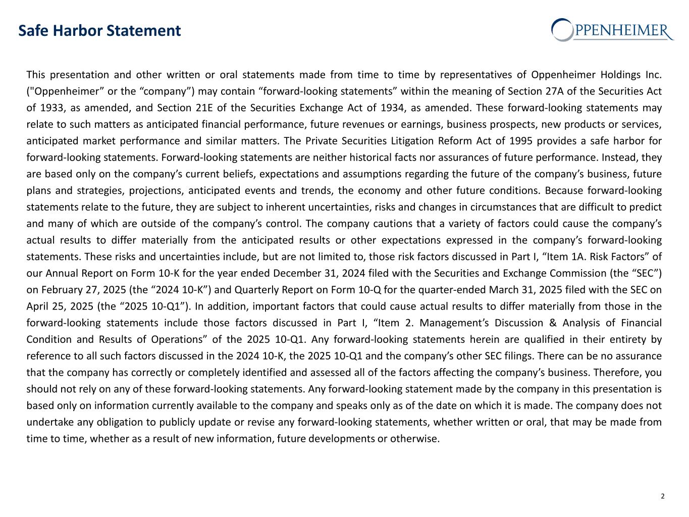 Safe Harbor Statement This presentation and other written or oral statements made from time to time by representatives of Oppenheimer Holdings Inc. ("Oppenheimer” or the “company”) may contain “forward-looking statements” within the meaning of Section 27A of the Securities Act of 1933, as amended, and Section 21E of the Securities Exchange Act of 1934, as amended. These forward-looking statements may relate to such matters as anticipated financial performance, future revenues or earnings, business prospects, new products or services, anticipated market performance and similar matters. The Private Securities Litigation Reform Act of 1995 provides a safe harbor for forward-looking statements. Forward-looking statements are neither historical facts nor assurances of future performance. Instead, they are based only on the company’s current beliefs, expectations and assumptions regarding the future of the company’s business, future plans and strategies, projections, anticipated events and trends, the economy and other future conditions. Because forward-looking statements relate to the future, they are subject to inherent uncertainties, risks and changes in circumstances that are difficult to predict and many of which are outside of the company’s control. The company cautions that a variety of factors could cause the company’s actual results to differ materially from the anticipated results or other expectations expressed in the company’s forward-looking statements. These risks and uncertainties include, but are not limited to, those risk factors discussed in Part I, “Item 1A. Risk Factors” of our Annual Report on Form 10-K for the year ended December 31, 2024 filed with the Securities and Exchange Commission (the “SEC”) on February 27, 2025 (the “2024 10-K”) and Quarterly Report on Form 10-Q for the quarter-ended March 31, 2025 filed with the SEC on April 25, 2025 (the “2025 10-Q1”). In addition, important factors that could cause actual results to differ materially from those in the forward-looking statements include those factors discussed in Part I, “Item 2. Management’s Discussion & Analysis of Financial Condition and Results of Operations” of the 2025 10-Q1. Any forward-looking statements herein are qualified in their entirety by reference to all such factors discussed in the 2024 10-K, the 2025 10-Q1 and the company’s other SEC filings. There can be no assurance that the company has correctly or completely identified and assessed all of the factors affecting the company’s business. Therefore, you should not rely on any of these forward-looking statements. Any forward-looking statement made by the company in this presentation is based only on information currently available to the company and speaks only as of the date on which it is made. The company does not undertake any obligation to publicly update or revise any forward-looking statements, whether written or oral, that may be made from time to time, whether as a result of new information, future developments or otherwise. 2