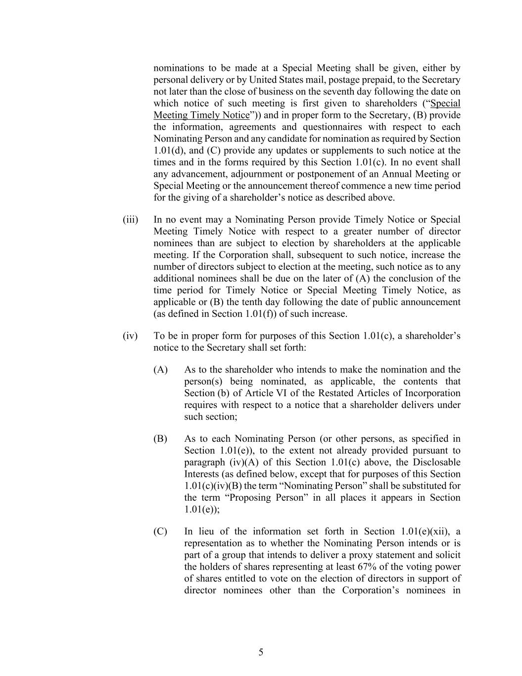 4 adjournment or postponement thereof). For the avoidance of doubt, the obligation to update and supplement as set forth in this paragraph or any other Section of these by-laws shall not limit the Corporation’s rights with respect to any deficiencies in any notice provided by a shareholder, extend any applicable deadlines hereunder or enable or be deemed to permit a shareholder who has previously submitted notice hereunder to amend or update any proposal or to submit any new proposal, including by changing or adding matters, business or resolutions proposed to be brought before an Annual Meeting. (vi) This Section 1.01(b) is expressly intended to apply to any business proposed to be brought before an Annual Meeting other than any proposal made in accordance with Rule 14a-8 under the Exchange Act and included in the Corporation’s proxy statement. In addition to the requirements of this Section 1.01(b) with respect to any business proposed to be brought before an Annual Meeting, each Proposing Person shall comply with all applicable requirements of the Exchange Act with respect to any such business. Nothing in this Section 1.01(b) shall be deemed to affect the rights of shareholders to request inclusion of proposals in the Corporation’s proxy statement pursuant to Rule 14a-8 under the Exchange Act. (c) Advance Notice Procedures for Nominations of Directors for Annual Meetings and Special Meetings. (i) Nominations of any person for election to the Board at an Annual Meeting or at a Special Meeting (but only if the election of directors is a matter specified in the notice of meeting given by or at the direction of the person calling such Special Meeting) may be made at such meeting only (A) by the Board or a committee appointed by the Board or (B) by a shareholder present in person who (1) was a shareholder entitled to vote generally in the election of directors, (2) has complied with the contents of Article VI of the Restated Articles of Incorporation and (3) has complied with this Section 1.01(c) and applicable law. The foregoing clause (B) shall be the exclusive means for a shareholder to make any nomination of a person or persons for election to the Board at an Annual Meeting or a Special Meeting. The chairman of the Annual Meeting may refuse to acknowledge the nomination of any person not properly made in compliance with Section (b) of Article VI of the Restated Articles of Incorporation, this Section 1.01(c) or applicable law, and in such case, such defective nomination shall be disregarded and any ballots cast for the candidate in question (but in the case of any form of ballot listing other qualified nominees, only the ballots cast for the nominee in question) shall be void and of no force or effect. (ii) For nominations to be properly brought before an Annual Meeting or a Special Meeting, the shareholder must (A) provide Timely Notice thereof in writing (provided that, to be timely, a shareholder’s notice for