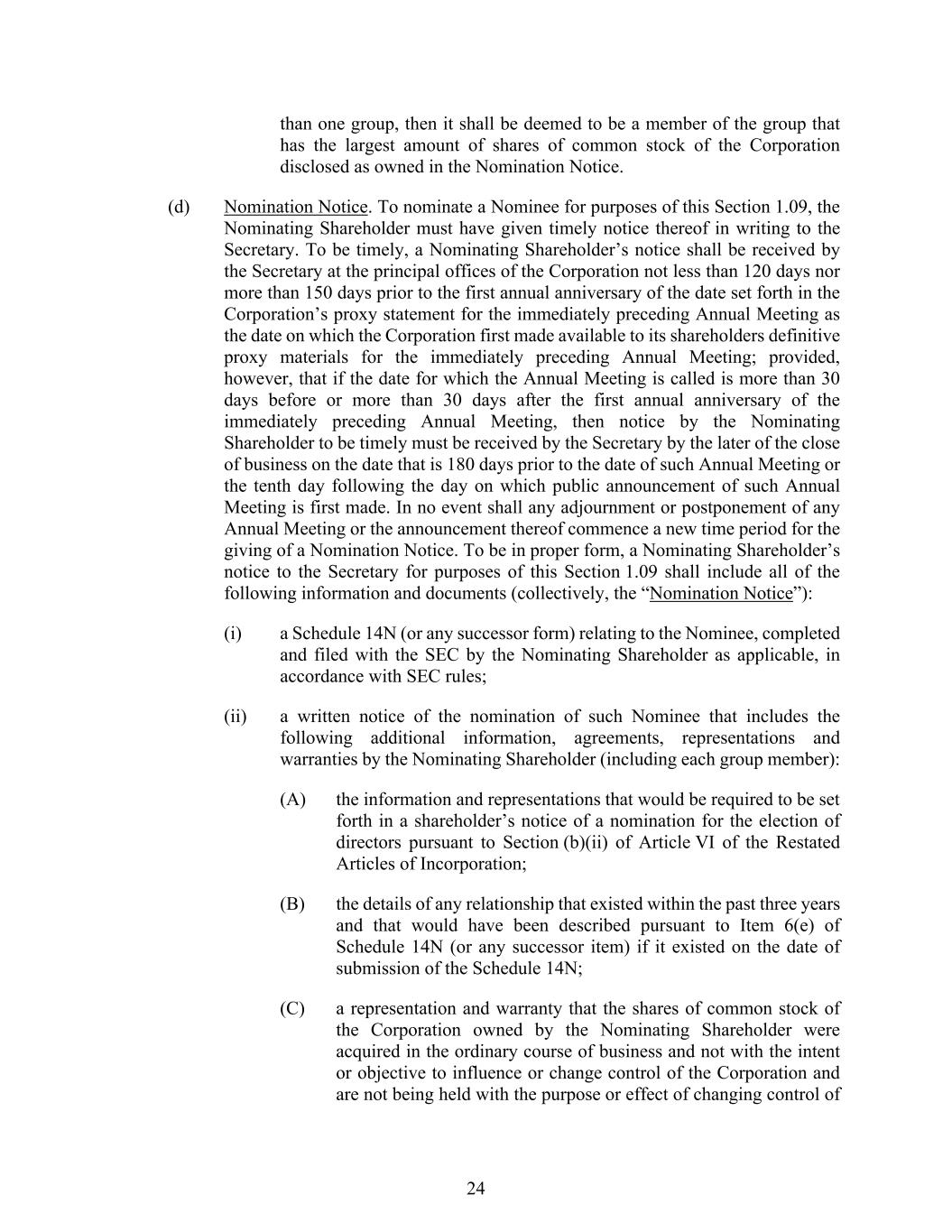 21 the highest ranking Nominee who meets the requirements of this Section 1.09 from each Nominating Shareholder will be selected for inclusion in the Corporation’s proxy statement until the Maximum Number is reached, going in order of the amount (largest to smallest) of the shares of common stock of the Corporation disclosed as owned in each Nominating Shareholder’s Nomination Notice. (iii) If, after the Final Nomination Date, (A) the Corporation is notified, or the Board or its designee, acting in good faith, determines, that (1) a Nominating Shareholder has failed to satisfy or to continue to satisfy the eligibility requirements described in Section 1.09(c), (2) any of the representations and warranties made in the Nomination Notice cease to be true and accurate in all material respects (or omit a material fact necessary to make the statements therein not misleading) or (3) any material violation or breach occurs of the obligations, agreements, representations or warranties of the Nominating Shareholder or the Nominee under this Section 1.09, (B) a Nominating Shareholder or any qualified representative thereof does not appear at the Annual Meeting to present any nomination submitted pursuant to this Section 1.09, or the Nominating Shareholder withdraws its nomination, or (C) a Nominee becomes ineligible for inclusion in the Corporation’s proxy statement pursuant to this Section 1.09 or dies, becomes disabled or is otherwise disqualified from being nominated for election or serving as a director of the Corporation or is unwilling or unable to serve as a director of the Corporation, in each case as determined by the Board or its designee, acting in good faith, whether before or after the Corporation’s definitive proxy statement for such Annual Meeting is made available to shareholders, then the nomination of the Nominating Shareholder or such Nominee, as the case may be, shall be disregarded and no vote on such Nominee will occur (notwithstanding that proxies in respect of such vote may have been received by the Corporation), the Nominating Shareholder may not cure in any way any defect preventing the nomination of the Nominee, and the Corporation (1) may omit from its proxy statement and any ballot or form of proxy the disregarded Nominee and any information concerning such Nominee (including a Nominating Shareholder’s statement in support), any other Nominee that the Corporation had determined not to include in its proxy statement and proxy card for such Annual Meeting and any successor or replacement nominee proposed by the Nominating Shareholder or by any other Nominating Shareholder and (2) may otherwise communicate to its shareholders, including without limitation by amending or supplementing its proxy statement or ballot or form of proxy, that the Nominee will not be included as a Nominee in the proxy statement or on any ballot or form of proxy and will not be voted on at the Annual Meeting.