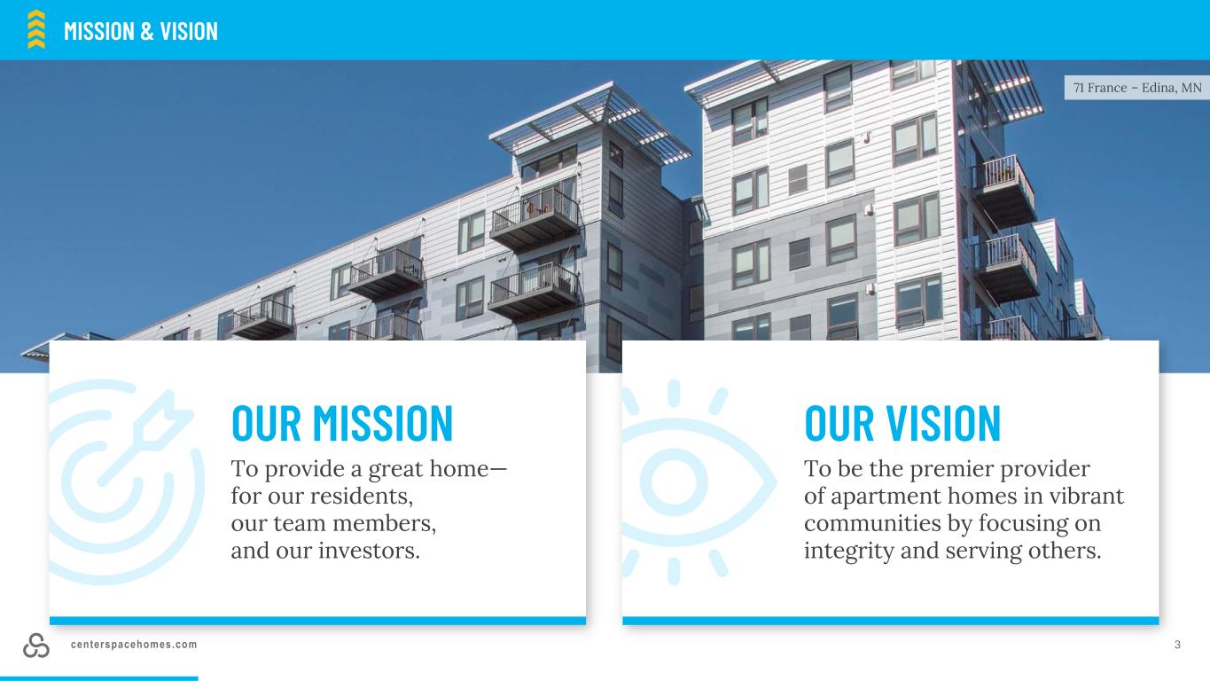 OUR MISSION To provide a great home— for our residents, our team members, and our investors. OUR VISION To be the premier provider of apartment homes in vibrant communities by focusing on integrity and serving others. 71 France – Edina, MN MISSION & VISION 3centerspacehomes.com