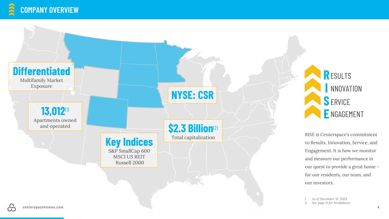 centerspacehomes.com 2 Certain statements in this presentation are “forward-looking statements” within the meaning of the Private Securities Litigation Reform Act of 1995. Such statements involve known and unknown risks, uncertainties, and other factors that may cause actual results to differ materially from expected results. These statements may be identified by our use of words such as “expects,” “plans,” “estimates,” “anticipates,” “projects,” “intends,” “believes,” and similar expressions that do not relate to historical matters. Such risks, uncertainties, and other factors include, but are not limited to, changes in general and local economic and real estate market conditions, rental conditions in our markets, fluctuations in interest rates, the effect of government regulations, the availability and cost of capital and other financing risks, risks associated with our value- add and redevelopment opportunities, the failure of our property acquisition and disposition activities to achieve expected results, competition in our markets, our ability to attract and retain skilled personnel, our ability to maintain our tax status as a real estate investment trust (REIT), and those risks and uncertainties detailed from time to time in our filings with the Securities and Exchange Commission, including the “Management’s Discussion and Analysis of Financial Condition and Results of Operations” and “Risk Factors” contained in our Form 10-K for the period ended December 31, 2024. We assume no obligation to update or supplement forward-looking statements that become untrue due to subsequent events. SAFE HARBOR STATEMENT & LEGAL DISCLOSURE