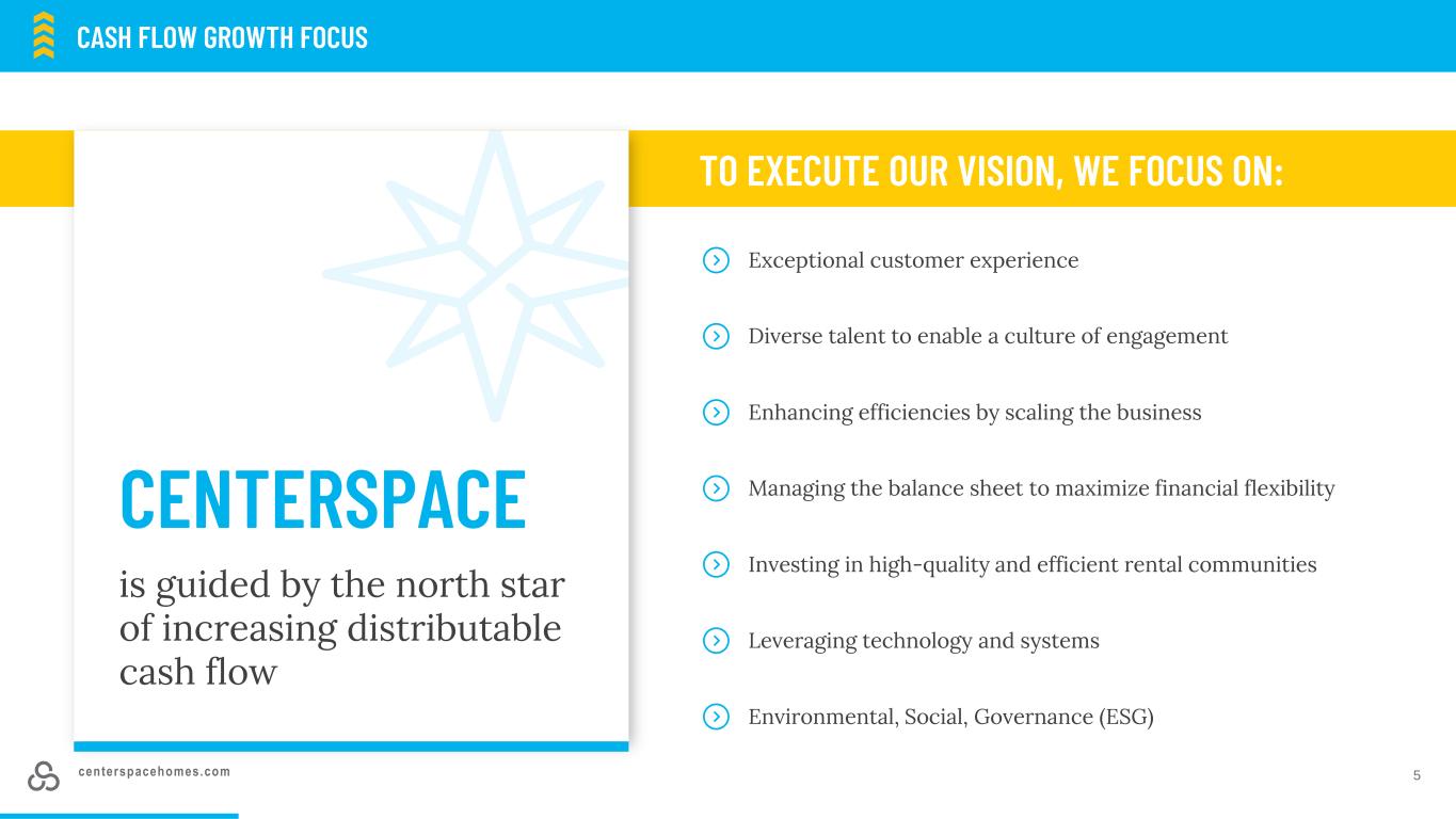 TO EXECUTE OUR VISION, WE FOCUS ON: CENTERSPACE is guided by the north star of increasing distributable cash flow Exceptional customer experience Diverse talent to enable a culture of engagement Enhancing efficiencies by scaling the business Managing the balance sheet to maximize financial flexibility Investing in high-quality and efficient rental communities Leveraging technology and systems Environmental, Social, Governance (ESG) CASH FLOW GROWTH FOCUS 5centerspacehomes.com