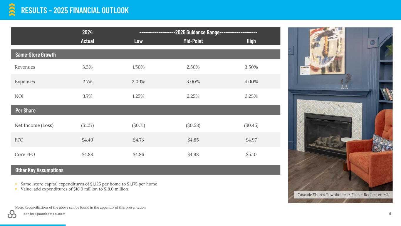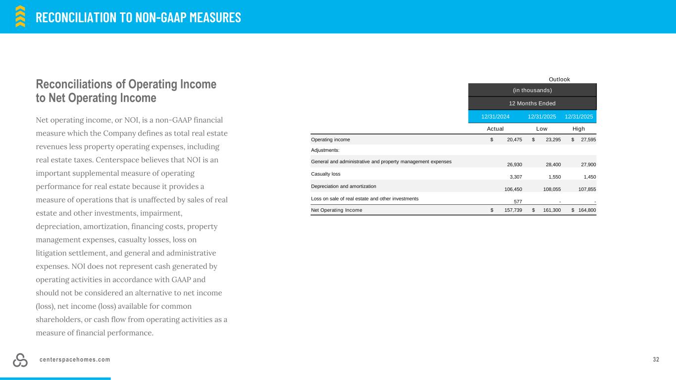 centerspacehomes.com 30 RECONCILIATION TO NON-GAAP MEASURES UpdatedRECONCILIATION TO NON-GAAP MEASURESRECONCILIATION TO NON-GAAP MEASURES Outlook (in thousands) 12 Months Ended 12/31/2024 12/31/2025 12/31/2025 Actual Low High Net loss available to common shareholders $ (19,660) $ (10,845) $ (5,945) Noncontrolling interests - Operating Partnership and Series E preferred units (3,635) (3,200) (3,000) Depreciation and amortization 106,450 108,055 107,855 Less depreciation - non real estate (327) (350) (300) Less depreciation - partially owned entities (98) (250) (300) Loss on sale of real estate 577 -- -- Dividends to Series D preferred unitholders 640 640 640 FFO applicable to common shares and Units $ 83,947 $ 94,050 $ 98,950 Adjustments to Core FFO: Non-cash casualty loss 2,432 525 475 Interest rate swap amortization 712 475 450 Amortization of assumed debt 1,206 1,700 1,650 Redemption of preferred shares 3,511 -- -- Other miscellaneous items (489) 50 100 Core FFO applicable to common shares and Units $ 91,319 $ 96,800 $ 101,625 Net loss per share - diluted $ (1.27) $ (0.71) $ (0.45) FFO per share - diluted $ 4.49 $ 4.73 $ 4.97 Core FFO per share - diluted $ 4.88 $ 4.86 $ 5.10