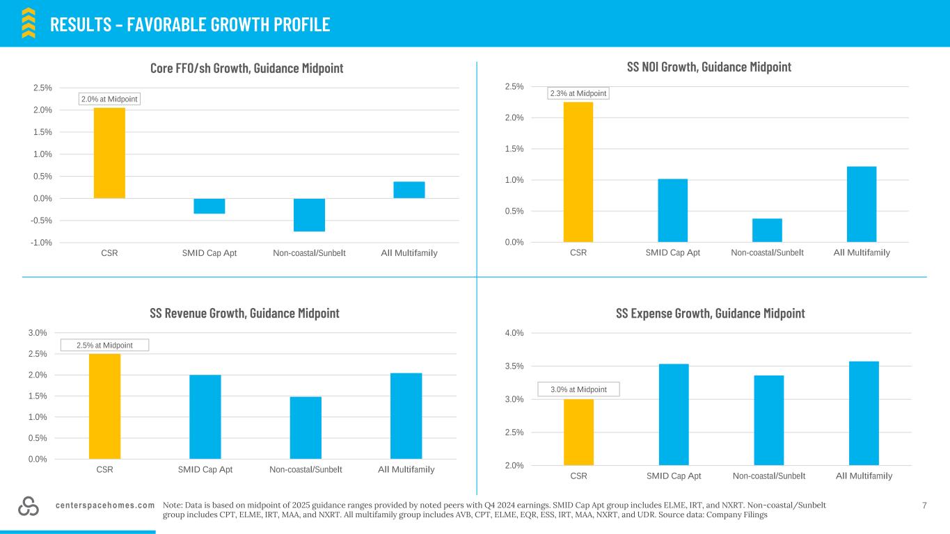 centerspacehomes.com 6 2024 -------------------2025 Guidance Range-------------------- Actual Low Mid-Point High Revenues 3.3% 1.50% 2.50% 3.50% Expenses 2.7% 2.00% 3.00% 4.00% NOI 3.7% 1.25% 2.25% 3.25% Net Income (Loss) ($1.27) ($0.71) ($0.58) ($0.45) FFO $4.49 $4.73 $4.85 $4.97 Core FFO $4.88 $4.86 $4.98 $5.10 Same-Store Growth Per Share Other Key Assumptions Cascade Shores Townhomes + Flats – Rochester, MN RESULTS – 2025 FINANCIAL OUTLOOK ▪ Same-store capital expenditures of $1,125 per home to $1,175 per home ▪ Value-add expenditures of $16.0 million to $18.0 million Note: Reconciliations of the above can be found in the appendix of this presentation