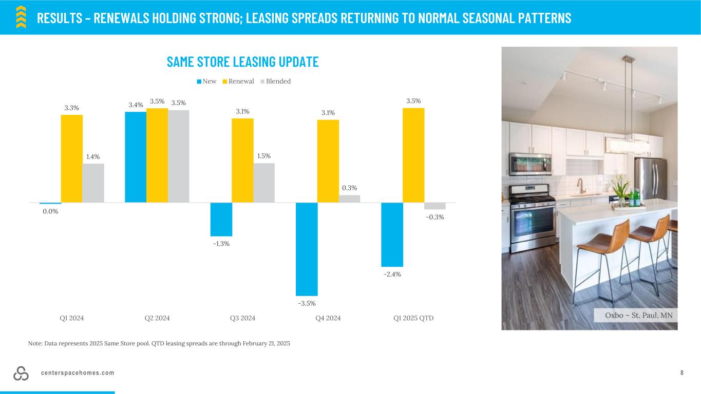 centerspacehomes.com RESULTS – FAVORABLE GROWTH PROFILE 7Note: Data is based on midpoint of 2025 guidance ranges provided by noted peers with Q4 2024 earnings. SMID Cap Apt group includes ELME, IRT, and NXRT. Non-coastal/Sunbelt group includes CPT, ELME, IRT, MAA, and NXRT. All multifamily group includes AVB, CPT, ELME, EQR, ESS, IRT, MAA, NXRT, and UDR. Source data: Company Filings 2.0% at Midpoint -1.0% -0.5% 0.0% 0.5% 1.0% 1.5% 2.0% 2.5% CSR SMID Cap Apt Non-coastal/Sunbelt All Multifamily Core FFO/sh Growth, Guidance Midpoint 2.3% at Midpoint 0.0% 0.5% 1.0% 1.5% 2.0% 2.5% CSR SMID Cap Apt Non-coastal/Sunbelt All Multifamily SS NOI Growth, Guidance Midpoint 2.5% at Midpoint 0.0% 0.5% 1.0% 1.5% 2.0% 2.5% 3.0% CSR SMID Cap Apt Non-coastal/Sunbelt All Multifamily SS Revenue Growth, Guidance Midpoint 3.0% at Midpoint 2.0% 2.5% 3.0% 3.5% 4.0% CSR SMID Cap Apt Non-coastal/Sunbelt All Multifamily SS Expense Growth, Guidance Midpoint