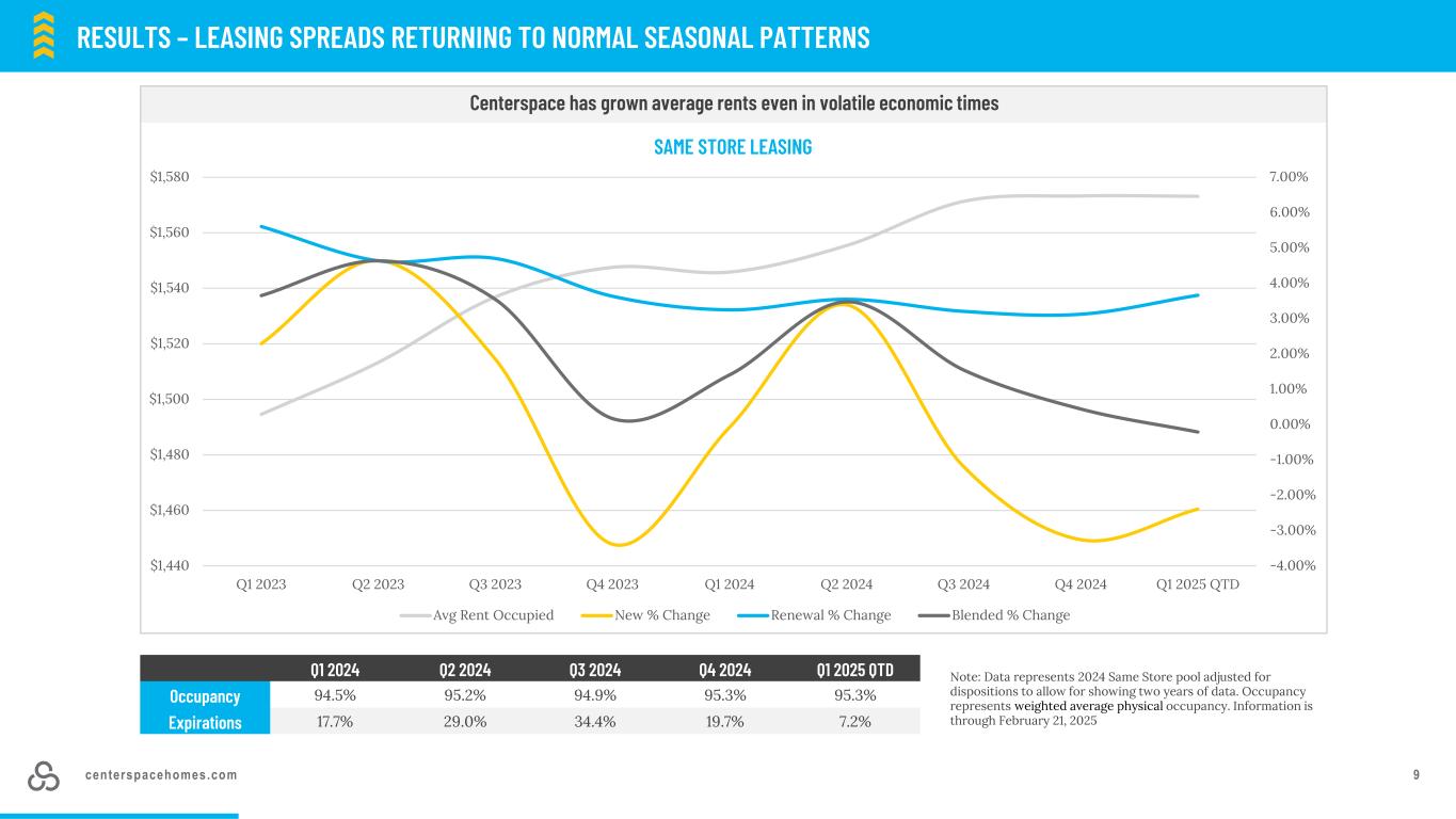 centerspacehomes.com 8 Note: Data represents 2025 Same Store pool. QTD leasing spreads are through February 21, 2025 RESULTS – RENEWALS HOLDING STRONG; LEASING SPREADS RETURNING TO NORMAL SEASONAL PATTERNS Oxbo – St. Paul, MN 0.0% 3.4% -1.3% -3.5% -2.4% 3.3% 3.5% 3.1% 3.1% 3.5% 1.4% 3.5% 1.5% 0.3% -0.3% Q1 2024 Q2 2024 Q3 2024 Q4 2024 Q1 2025 QTD SAME STORE LEASING UPDATE New Renewal Blended