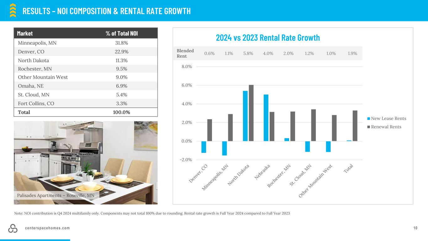 centerspacehomes.com 9 -4.00% -3.00% -2.00% -1.00% 0.00% 1.00% 2.00% 3.00% 4.00% 5.00% 6.00% 7.00% $1,440 $1,460 $1,480 $1,500 $1,520 $1,540 $1,560 $1,580 Q1 2023 Q2 2023 Q3 2023 Q4 2023 Q1 2024 Q2 2024 Q3 2024 Q4 2024 Q1 2025 QTD SAME STORE LEASING Avg Rent Occupied New % Change Renewal % Change Blended % Change Q1 2024 Q2 2024 Q3 2024 Q4 2024 Q1 2025 QTD Occupancy 94.5% 95.2% 94.9% 95.3% 95.3% Expirations 17.7% 29.0% 34.4% 19.7% 7.2% Note: Data represents 2024 Same Store pool adjusted for dispositions to allow for showing two years of data. Occupancy represents weighted average physical occupancy. Information is through February 21, 2025 RESULTS – LEASING SPREADS RETURNING TO NORMAL SEASONAL PATTERNS Centerspace has grown average rents even in volatile economic times