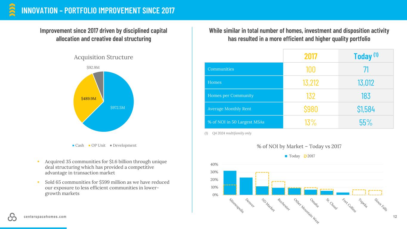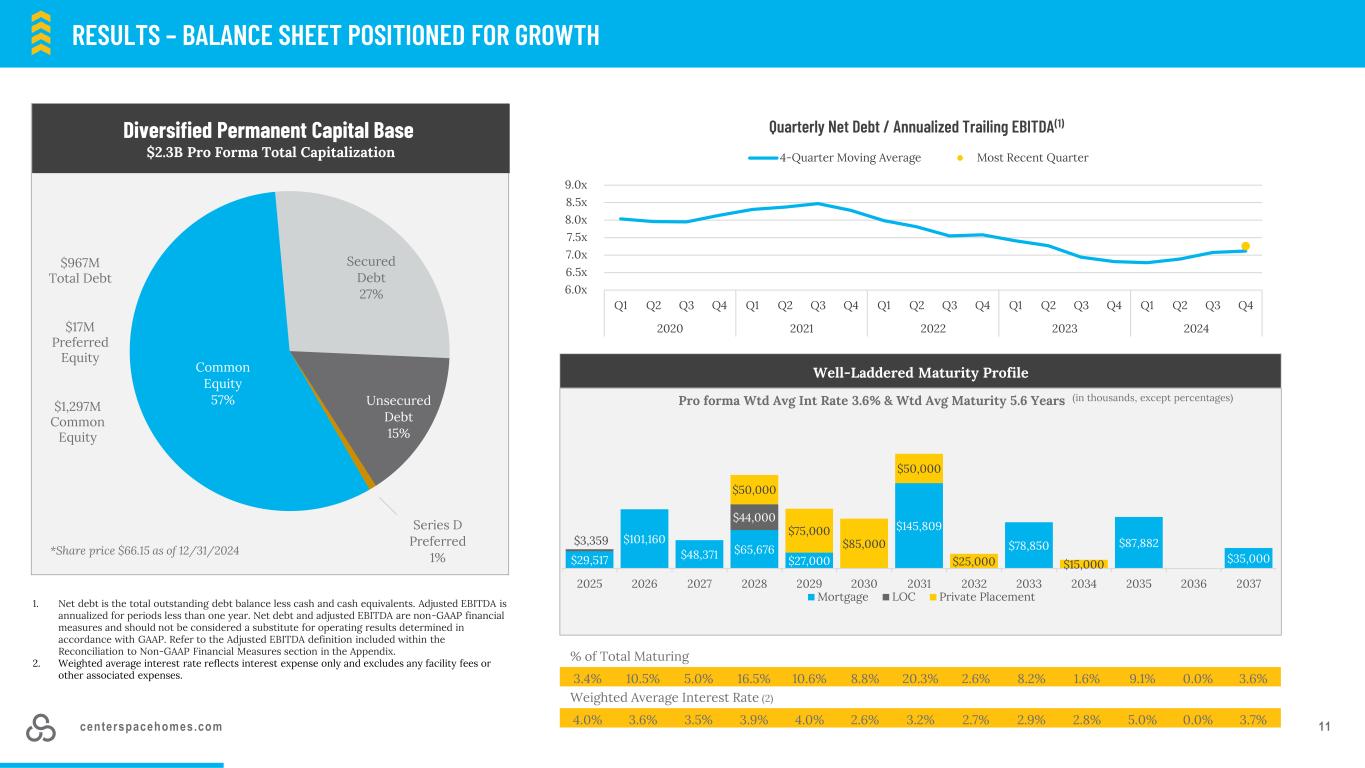 centerspacehomes.com 11 1. Net debt is the total outstanding debt balance less cash and cash equivalents. Adjusted EBITDA is annualized for periods less than one year. Net debt and adjusted EBITDA are non-GAAP financial measures and should not be considered a substitute for operating results determined in accordance with GAAP. Refer to the Adjusted EBITDA definition included within the Reconciliation to Non-GAAP Financial Measures section in the Appendix. 2. Weighted average interest rate reflects interest expense only and excludes any facility fees or other associated expenses. RESULTS – BALANCE SHEET POSITIONED FOR GROWTH Common Equity 57% Secured Debt 27% Unsecured Debt 15% Series D Preferred 1%*Share price $66.15 as of 12/31/2024 Diversified Permanent Capital Base $2.3B Pro Forma Total Capitalization $967M Total Debt $1,297M Common Equity $17M Preferred Equity % of Total Maturing 3.4% 10.5% 5.0% 16.5% 10.6% 8.8% 20.3% 2.6% 8.2% 1.6% 9.1% 0.0% 3.6% Weighted Average Interest Rate (2) 4.0% 3.6% 3.5% 3.9% 4.0% 2.6% 3.2% 2.7% 2.9% 2.8% 5.0% 0.0% 3.7% Well-Laddered Maturity Profile Pro forma Wtd Avg Int Rate 3.6% & Wtd Avg Maturity 5.6 Years (in thousands, except percentages) 6.0x 6.5x 7.0x 7.5x 8.0x 8.5x 9.0x Q1 Q2 Q3 Q4 Q1 Q2 Q3 Q4 Q1 Q2 Q3 Q4 Q1 Q2 Q3 Q4 Q1 Q2 Q3 Q4 2020 2021 2022 2023 2024 Quarterly Net Debt / Annualized Trailing EBITDA(1) 4-Quarter Moving Average Most Recent Quarter $29,517 $101,160 $48,371 $65,676 $27,000 $145,809 $78,850 $87,882 $35,000 $3,359 $44,000 $50,000 $75,000 $85,000 $50,000 $25,000 $15,000 2025 2026 2027 2028 2029 2030 2031 2032 2033 2034 2035 2036 2037 Mortgage LOC Private Placement