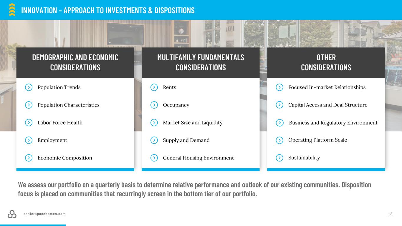 centerspacehomes.com 12 ▪ Acquired 35 communities for $1.6 billion through unique deal structuring which has provided a competitive advantage in transaction market ▪ Sold 65 communities for $599 million as we have reduced our exposure to less efficient communities in lower- growth markets 2017 Today (1) Communities 100 71 Homes 13,212 13,012 Homes per Community 132 183 Average Monthly Rent $980 $1,584 % of NOI in 50 Largest MSAs 13% 55% % of NOI by Market – Today vs 2017 (1) Q4 2024 multifamily only INNOVATION – PORTFOLIO IMPROVEMENT SINCE 2017 Improvement since 2017 driven by disciplined capital allocation and creative deal structuring While similar in total number of homes, investment and disposition activity has resulted in a more efficient and higher quality portfolio $972.5M $489.9M $92.9M Acquisition Structure Cash OP Unit Development 0% 10% 20% 30% 40% Today 2017