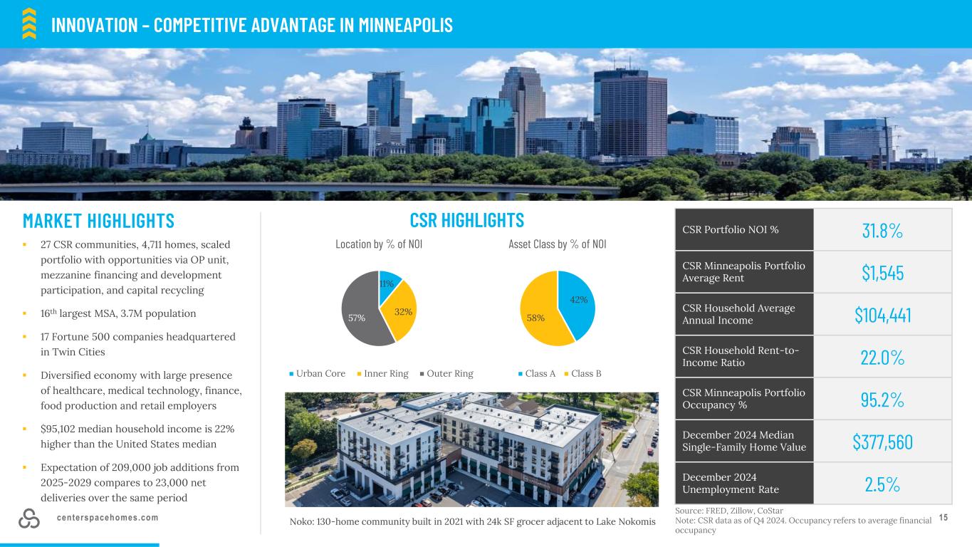 centerspacehomes.com 15 ▪ 27 CSR communities, 4,711 homes, scaled portfolio with opportunities via OP unit, mezzanine financing and development participation, and capital recycling ▪ 16th largest MSA, 3.7M population ▪ 17 Fortune 500 companies headquartered in Twin Cities ▪ Diversified economy with large presence of healthcare, medical technology, finance, food production and retail employers ▪ $95,102 median household income is 22% higher than the United States median ▪ Expectation of 209,000 job additions from 2025-2029 compares to 23,000 net deliveries over the same period MARKET HIGHLIGHTS Noko: 130-home community built in 2021 with 24k SF grocer adjacent to Lake Nokomis CSR Portfolio NOI % 31.8% CSR Minneapolis Portfolio Average Rent $1,545 CSR Household Average Annual Income $104,441 CSR Household Rent-to- Income Ratio 22.0% CSR Minneapolis Portfolio Occupancy % 95.2% December 2024 Median Single-Family Home Value $377,560 December 2024 Unemployment Rate 2.5% INNOVATION – COMPETITIVE ADVANTAGE IN MINNEAPOLIS CSR HIGHLIGHTS Source: FRED, Zillow, CoStar Note: CSR data as of Q4 2024. Occupancy refers to average financial occupancy 11% 32% 57% Location by % of NOI Urban Core Inner Ring Outer Ring 42% 58% Asset Class by % of NOI Class A Class B