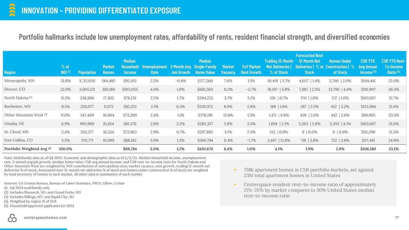 centerspacehomes.com 16 ▪ 8 CSR communities, 2,233 homes, entered Denver Q4 2017 and achieved critical mass ▪ 19th largest MSA, 3.0M population ▪ 9 Fortune 500 companies headquartered in Colorado ▪ Diversified economy with large presence of aviation/aerospace, healthcare, telecommunications and tech employers ▪ $103,055 median household income is 33% higher than the United States median ▪ Expectation of 328,000 job additions from 2025-2029 compares to 31,000 net deliveries over the same period MARKET HIGHLIGHTS Lyra: 215-home community in Centennial; 2022 built in Denver’s SE Business Corridor CSR Portfolio NOI % 22.9% CSR Denver Portfolio Average Rent $1,983 CSR Household Average Annual Income $110,907 CSR Household Rent-to- Income Ratio 26.3% CSR Denver Portfolio Occupancy % 94.9% December 2024 Median Single-Family Home Value $601,363 December 2024 Unemployment Rate 4.6% INNOVATION – GROWTH IN DENVER CSR HIGHLIGHTS 41% 59% Location by % of NOI Urban Suburban 100% Asset Class by % of NOI Class A Source: FRED, Zillow, CoStar Note: CSR data as of Q4 2024. Occupancy refers to average financial occupancy