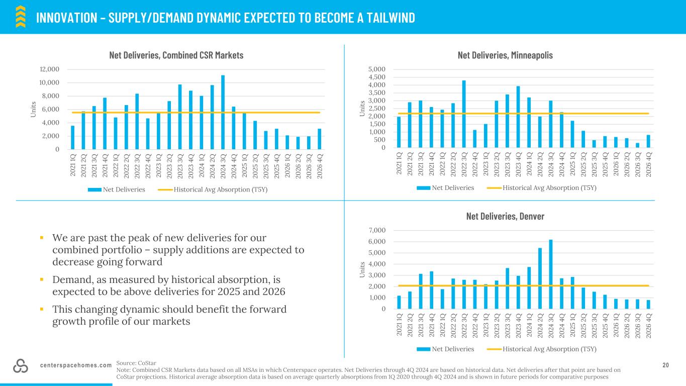 centerspacehomes.com GEOGRAPHIC DIFFERENTIATION INNOVATION – DEMOGRAPHICS VS HOUSING DELIVERIES ARE ATTRACTIVE PROVEN EXECUTION 19 ▪ New household formations exceed supply deliveries by over 4MM since 2011 ▪ New construction starts started to fall in 2022 and will lead to lower deliveries going forward ▪ A shift in the age of average first-time homebuyers has added more individuals to the renter demographic Source: FRED, US Census Bureau, US Dept. of Housing and Urban Development, Self.com Note: Housing Supply and Household Formation Data through December 2024; New Supply Data through January 2025; CSR Data as of Q4 2024 1,200 1,300 1,400 1,500 1,600 1,700 1,800 1,900 Ja n 20 21 M ar 2 02 1 M ay 2 02 1 Ju l 2 02 1 Se p 20 21 N ov 2 02 1 Ja n 20 22 M ar 2 02 2 M ay 2 02 2 Ju l 2 02 2 Se p 20 22 N ov 2 02 2 Ja n 20 23 M ar 2 02 3 M ay 2 02 3 Ju l 2 02 3 Se p 20 23 N ov 2 02 3 Ja n 20 24 M ar 2 02 4 M ay 2 02 4 Ju l 2 02 4 Se p 20 24 N ov 2 02 4 Ja n 20 25 St ar ts (0 00 s) US Housing Starts (SAAR) Suggest New Supply to Decrease Avg age, 2014 first time buyer = 31 Avg age, 2024 first time buyer = 38 0 1,000 2,000 3,000 4,000 5,000 0 5 10 15 20 25 30 35 40 45 50 55 60 65 70 75 80 85 90 95 100 Po pu la ti on (0 00 s) Age US Population by Age - 1,000 2,000 3,000 4,000 5,000 6,000 (500) - 500 1,000 1,500 2,000 2,500 2011 2012 2013 2014 2015 2016 2017 2018 2019 2020 2021 2022 2023 2024 C um ul at iv e H ou si ng S ho rt fa ll (0 00 s) Fo rm an ti on s/ C om pl et io ns (0 00 s) Year US Housing is Still Structurally Undersupplied Household Formations (LHS) Unit Completions (LHS) Cumulative shortfall since 2011 (RHS)