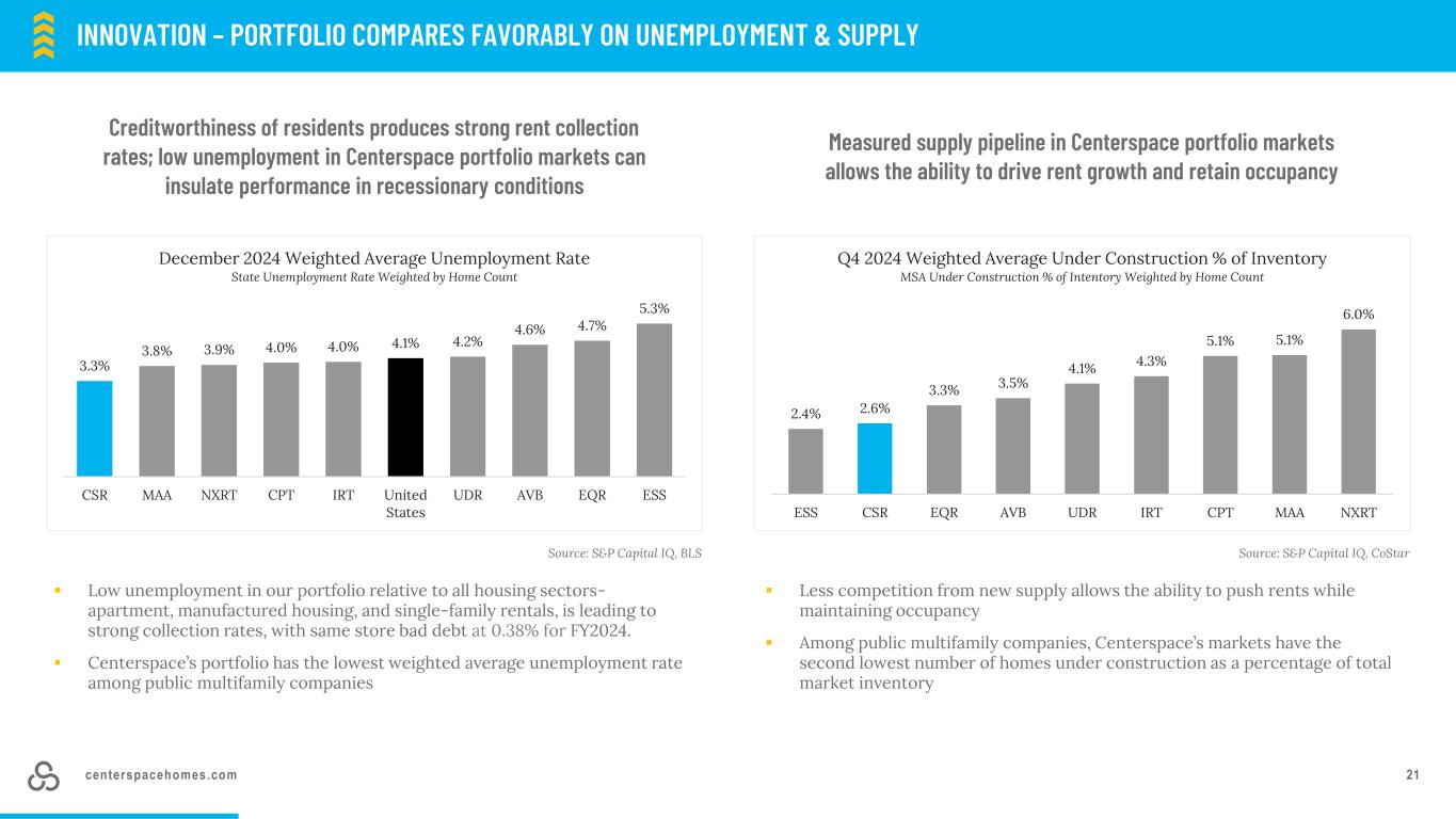 centerspacehomes.com 20 INNOVATION – SUPPLY/DEMAND DYNAMIC EXPECTED TO BECOME A TAILWIND Source: CoStar Note: Combined CSR Markets data based on all MSAs in which Centerspace operates. Net Deliveries through 4Q 2024 are based on historical data. Net deliveries after that point are based on CoStar projections. Historical average absorption data is based on average quarterly absorptions from 1Q 2020 through 4Q 2024 and is shown in future periods for comparative purposes ▪ We are past the peak of new deliveries for our combined portfolio – supply additions are expected to decrease going forward ▪ Demand, as measured by historical absorption, is expected to be above deliveries for 2025 and 2026 ▪ This changing dynamic should benefit the forward growth profile of our markets 0 2,000 4,000 6,000 8,000 10,000 12,000 20 21 1Q 20 21 2 Q 20 21 3 Q 20 21 4 Q 20 22 1Q 20 22 2 Q 20 22 3 Q 20 22 4 Q 20 23 1Q 20 23 2 Q 20 23 3 Q 20 23 4 Q 20 24 1Q 20 24 2 Q 20 24 3 Q 20 24 4 Q 20 25 1Q 20 25 2 Q 20 25 3 Q 20 25 4 Q 20 26 1Q 20 26 2 Q 20 26 3 Q 20 26 4 Q U ni ts Net Deliveries, Combined CSR Markets Net Deliveries Historical Avg Absorption (T5Y) 0 500 1,000 1,500 2,000 2,500 3,000 3,500 4,000 4,500 5,000 20 21 1Q 20 21 2 Q 20 21 3 Q 20 21 4 Q 20 22 1Q 20 22 2 Q 20 22 3 Q 20 22 4 Q 20 23 1Q 20 23 2 Q 20 23 3 Q 20 23 4 Q 20 24 1Q 20 24 2 Q 20 24 3 Q 20 24 4 Q 20 25 1Q 20 25 2 Q 20 25 3 Q 20 25 4 Q 20 26 1Q 20 26 2 Q 20 26 3 Q 20 26 4 Q U ni ts Net Deliveries, Minneapolis Net Deliveries Historical Avg Absorption (T5Y) 0 1,000 2,000 3,000 4,000 5,000 6,000 7,000 20 21 1Q 20 21 2 Q 20 21 3 Q 20 21 4 Q 20 22 1Q 20 22 2 Q 20 22 3 Q 20 22 4 Q 20 23 1Q 20 23 2 Q 20 23 3 Q 20 23 4 Q 20 24 1Q 20 24 2 Q 20 24 3 Q 20 24 4 Q 20 25 1Q 20 25 2 Q 20 25 3 Q 20 25 4 Q 20 26 1Q 20 26 2 Q 20 26 3 Q 20 26 4 Q U ni ts Net Deliveries, Denver Net Deliveries Historical Avg Absorption (T5Y)