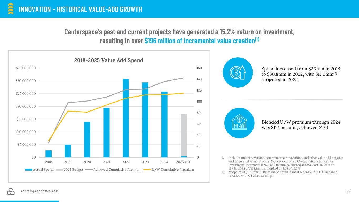 centerspacehomes.com 21 ▪ Low unemployment in our portfolio relative to all housing sectors- apartment, manufactured housing, and single-family rentals, is leading to strong collection rates, with same store bad debt at 0.38% for FY2024. ▪ Centerspace’s portfolio has the lowest weighted average unemployment rate among public multifamily companies ▪ Less competition from new supply allows the ability to push rents while maintaining occupancy ▪ Among public multifamily companies, Centerspace’s markets have the second lowest number of homes under construction as a percentage of total market inventory Source: S&P Capital IQ, CoStarSource: S&P Capital IQ, BLS INNOVATION – PORTFOLIO COMPARES FAVORABLY ON UNEMPLOYMENT & SUPPLY Creditworthiness of residents produces strong rent collection rates; low unemployment in Centerspace portfolio markets can insulate performance in recessionary conditions Measured supply pipeline in Centerspace portfolio markets allows the ability to drive rent growth and retain occupancy 3.3% 3.8% 3.9% 4.0% 4.0% 4.1% 4.2% 4.6% 4.7% 5.3% CSR MAA NXRT CPT IRT United States UDR AVB EQR ESS December 2024 Weighted Average Unemployment Rate State Unemployment Rate Weighted by Home Count 2.4% 2.6% 3.3% 3.5% 4.1% 4.3% 5.1% 5.1% 6.0% ESS CSR EQR AVB UDR IRT CPT MAA NXRT Q4 2024 Weighted Average Under Construction % of Inventory MSA Under Construction % of Intentory Weighted by Home Count
