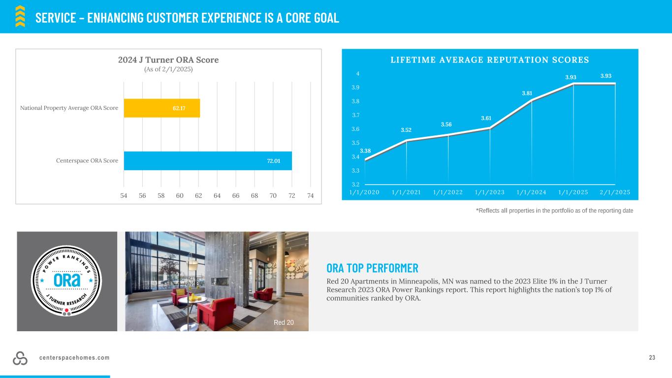 centerspacehomes.com 23 72.01 62.17 54 56 58 60 62 64 66 68 70 72 74 Centerspace ORA Score National Property Average ORA Score 2024 J Turner ORA Score (As of 2/1/2025) ORA TOP PERFORMER Red 20 Apartments in Minneapolis, MN was named to the 2023 Elite 1% in the J Turner Research 2023 ORA Power Rankings report. This report highlights the nation’s top 1% of communities ranked by ORA. *Reflects all properties in the portfolio as of the reporting date Red 20 SERVICE – ENHANCING CUSTOMER EXPERIENCE IS A CORE GOAL 3.38 3.52 3.56 3.61 3.81 3.93 3.93 3.2 3.3 3.4 3.5 3.6 3.7 3.8 3.9 4 1/1/2020 1/1/2021 1/1/2022 1/1/2023 1/1/2024 1/1/2025 2/1/2025 LIFETIME AVERAGE REPUTATION SCORES