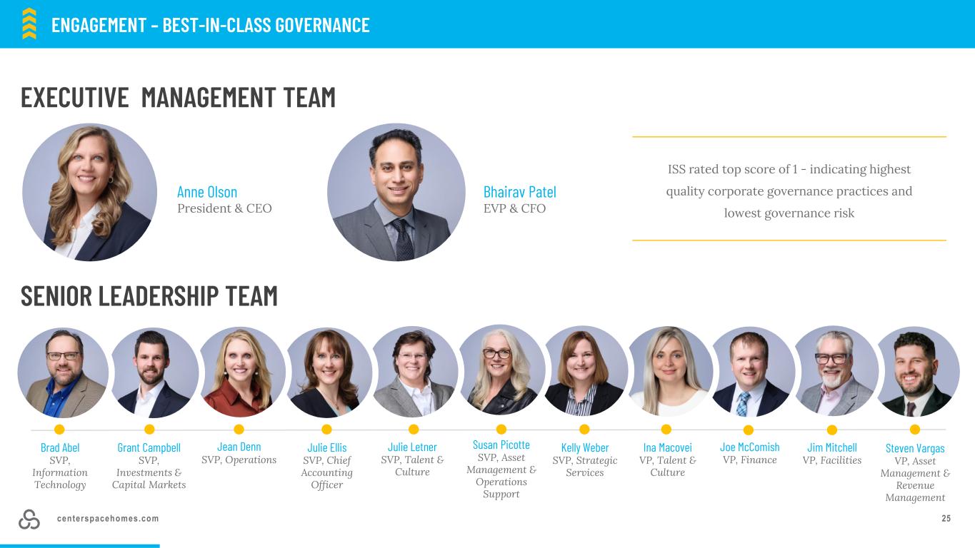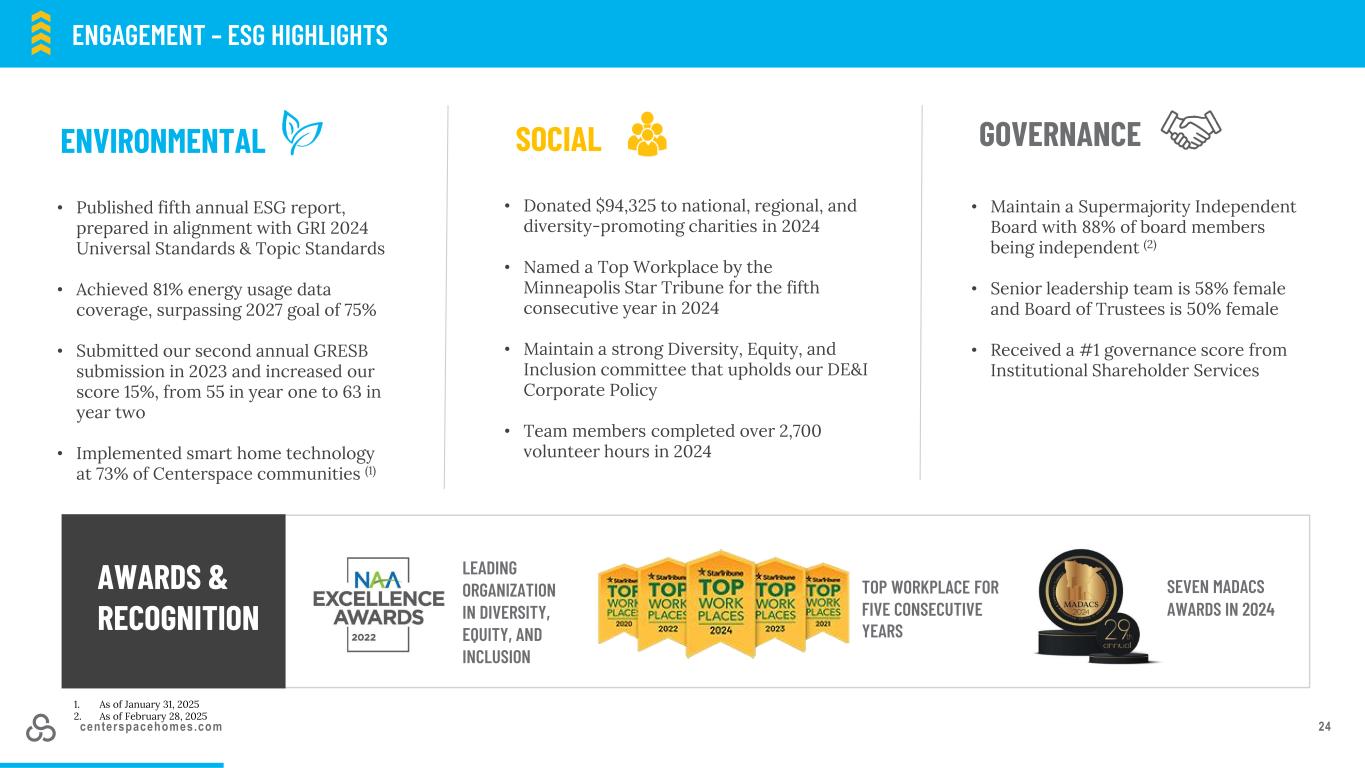 centerspacehomes.com 24 ENVIRONMENTAL SOCIAL GOVERNANCE • Published fifth annual ESG report, prepared in alignment with GRI 2024 Universal Standards & Topic Standards • Achieved 81% energy usage data coverage, surpassing 2027 goal of 75% • Submitted our second annual GRESB submission in 2023 and increased our score 15%, from 55 in year one to 63 in year two • Implemented smart home technology at 73% of Centerspace communities (1) • Maintain a Supermajority Independent Board with 88% of board members being independent (2) • Senior leadership team is 58% female and Board of Trustees is 50% female • Received a #1 governance score from Institutional Shareholder Services • Donated $94,325 to national, regional, and diversity-promoting charities in 2024 • Named a Top Workplace by the Minneapolis Star Tribune for the fifth consecutive year in 2024 • Maintain a strong Diversity, Equity, and Inclusion committee that upholds our DE&I Corporate Policy • Team members completed over 2,700 volunteer hours in 2024 LEADING ORGANIZATION IN DIVERSITY, EQUITY, AND INCLUSION TOP WORKPLACE FOR FIVE CONSECUTIVE YEARS SEVEN MADACS AWARDS IN 2024 ENGAGEMENT – ESG HIGHLIGHTS AWARDS & RECOGNITION 1. As of January 31, 2025 2. As of February 28, 2025