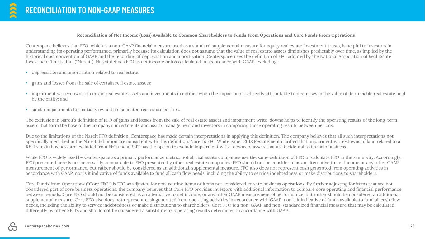 centerspacehomes.com 28 RECONCILIATION TO NON-GAAP MEASURES Reconciliation of Net Income (Loss) Available to Common Shareholders to Funds From Operations and Core Funds From Operations Centerspace believes that FFO, which is a non-GAAP financial measure used as a standard supplemental measure for equity real estate investment trusts, is helpful to investors in understanding its operating performance, primarily because its calculation does not assume that the value of real estate assets diminishes predictably over time, as implied by the historical cost convention of GAAP and the recording of depreciation and amortization. Centerspace uses the definition of FFO adopted by the National Association of Real Estate Investment Trusts, Inc. (“Nareit”). Nareit defines FFO as net income or loss calculated in accordance with GAAP, excluding: • depreciation and amortization related to real estate; • gains and losses from the sale of certain real estate assets; • impairment write-downs of certain real estate assets and investments in entities when the impairment is directly attributable to decreases in the value of depreciable real estate held by the entity; and • similar adjustments for partially owned consolidated real estate entities. The exclusion in Nareit’s definition of FFO of gains and losses from the sale of real estate assets and impairment write-downs helps to identify the operating results of the long-term assets that form the base of the company's investments and assists management and investors in comparing those operating results between periods. Due to the limitations of the Nareit FFO definition, Centerspace has made certain interpretations in applying this definition. The company believes that all such interpretations not specifically identified in the Nareit definition are consistent with this definition. Nareit’s FFO White Paper 2018 Restatement clarified that impairment write-downs of land related to a REIT’s main business are excluded from FFO and a REIT has the option to exclude impairment write-downs of assets that are incidental to its main business. While FFO is widely used by Centerspace as a primary performance metric, not all real estate companies use the same definition of FFO or calculate FFO in the same way. Accordingly, FFO presented here is not necessarily comparable to FFO presented by other real estate companies. FFO should not be considered as an alternative to net income or any other GAAP measurement of performance, but rather should be considered as an additional, supplemental measure. FFO also does not represent cash generated from operating activities in accordance with GAAP, nor is it indicative of funds available to fund all cash flow needs, including the ability to service indebtedness or make distributions to shareholders. Core Funds from Operations (“Core FFO”) is FFO as adjusted for non-routine items or items not considered core to business operations. By further adjusting for items that are not considered part of core business operations, the company believes that Core FFO provides investors with additional information to compare core operating and financial performance between periods. Core FFO should not be considered as an alternative to net income, or any other GAAP measurement of performance, but rather should be considered an additional supplemental measure. Core FFO also does not represent cash generated from operating activities in accordance with GAAP, nor is it indicative of funds available to fund all cash flow needs, including the ability to service indebtedness or make distributions to shareholders. Core FFO is a non-GAAP and non-standardized financial measure that may be calculated differently by other REITs and should not be considered a substitute for operating results determined in accordance with GAAP.