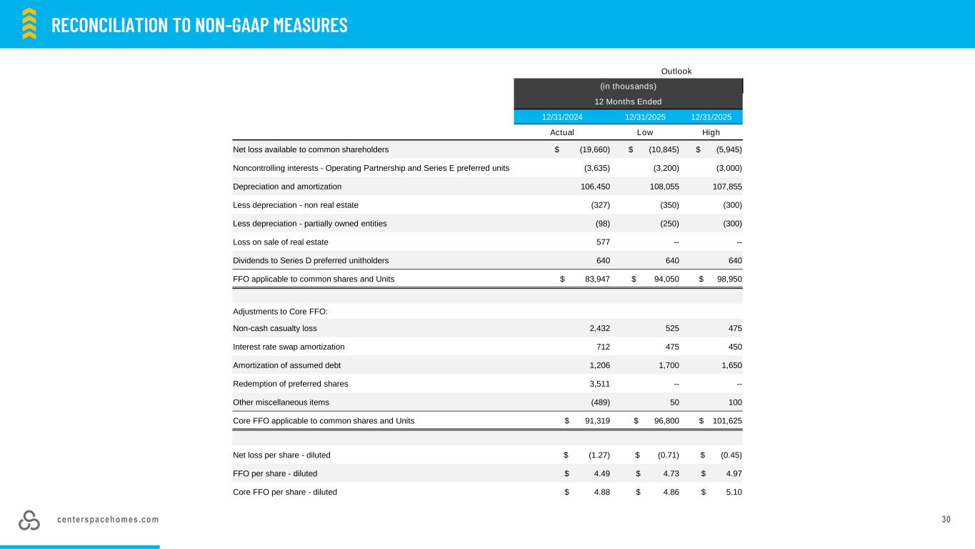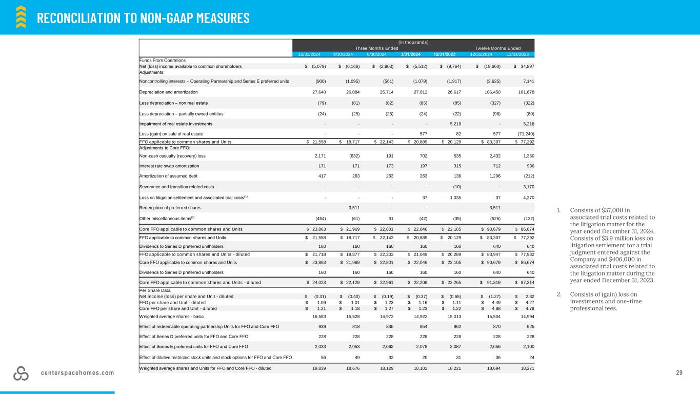 centerspacehomes.com 29 RECONCILIATION TO NON-GAAP MEASURES UpdatedRECONCILIATION TO NON-GAAP MEASURESRECONCILIATION TO NON-GAAP MEASURES 1. Consists of $37,000 in associated trial costs related to the litigation matter for the year ended December 31, 2024. Consists of $3.9 million loss on litigation settlement for a trial judgment entered against the Company and $406,000 in associated trial costs related to the litigation matter during the year ended December 31, 2023. 2. Consists of (gain) loss on investments and one-time professional fees. (in thousands) Three Months Ended Twelve Months Ended 12/31/2024 9/30/2024 6/30/2024 3/31/2024 12/31/2023 12/31/2024 12/31/2023 Funds From Operations Net (loss) income available to common shareholders $ (5,079) $ (6,166) $ (2,903) $ (5,512) $ (9,764) $ (19,660) $ 34,897 Adjustments: Noncontrolling interests – Operating Partnership and Series E preferred units (900) (1,095) (561) (1,079) (1,917) (3,635) 7,141 Depreciation and amortization 27,640 26,084 25,714 27,012 26,617 106,450 101,678 Less depreciation – non real estate (79) (81) (82) (85) (85) (327) (322) Less depreciation – partially owned entities (24) (25) (25) (24) (22) (98) (80) Impairment of real estate investments - - - - 5,218 - 5,218 Loss (gain) on sale of real estate - - - 577 82 577 (71,240) FFO applicable to common shares and Units $ 21,558 $ 18,717 $ 22,143 $ 20,889 $ 20,129 $ 83,307 $ 77,292 Adjustments to Core FFO: Non-cash casualty (recovery) loss 2,171 (632) 191 702 535 2,432 1,350 Interest rate swap amortization 171 171 173 197 315 712 936 Amortization of assumed debt 417 263 263 263 136 1,206 (212) Severance and transition related costs - - - - (10) - 3,170 Loss on litigation settlement and associated trial costs(1) - - - 37 1,035 37 4,270 Redemption of preferred shares - 3,511 - - - 3,511 - Other miscellaneous items(2) (454) (61) 31 (42) (35) (526) (132) Core FFO applicable to common shares and Units $ 23,863 $ 21,969 $ 22,801 $ 22,046 $ 22,105 $ 90,679 $ 86,674 FFO applicable to common shares and Units $ 21,558 $ 18,717 $ 22,143 $ 20,889 $ 20,129 $ 83,307 $ 77,292 Dividends to Series D preferred unitholders 160 160 160 160 160 640 640 FFO applicable to common shares and Units - diluted $ 21,718 $ 18,877 $ 22,303 $ 21,049 $ 20,289 $ 83,947 $ 77,932 Core FFO applicable to common shares and Units $ 23,863 $ 21,969 $ 22,801 $ 22,046 $ 22,105 $ 90,679 $ 86,674 Dividends to Series D preferred unitholders 160 160 160 160 160 640 640 Core FFO applicable to common shares and Units - diluted $ 24,023 $ 22,129 $ 22,961 $ 22,206 $ 22,265 $ 91,319 $ 87,314 Per Share Data Net income (loss) per share and Unit - diluted $ (0.31) $ (0.40) $ (0.19) $ (0.37) $ (0.65) $ (1.27) $ 2.32 FFO per share and Unit - diluted $ 1.09 $ 1.01 $ 1.23 $ 1.16 $ 1.11 $ 4.49 $ 4.27 Core FFO per share and Unit - diluted $ 1.21 $ 1.18 $ 1.27 $ 1.23 $ 1.22 $ 4.88 $ 4.78 Weighted average shares - basic 16,583 15,528 14,972 14,922 15,013 15,504 14,994 Effect of redeemable operating partnership Units for FFO and Core FFO 939 818 835 854 862 870 925 Effect of Series D preferred units for FFO and Core FFO 228 228 228 228 228 228 228 Effect of Series E preferred units for FFO and Core FFO 2,033 2,053 2,062 2,078 2,087 2,056 2,100 Effect of dilutive restricted stock units and stock options for FFO and Core FFO 56 49 32 20 31 36 24 Weighted average shares and Units for FFO and Core FFO - diluted 19,839 18,676 18,129 18,102 18,221 18,694 18,271