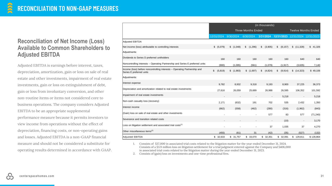 centerspacehomes.com 31 Reconciliation of Net Income (Loss) Available to Common Shareholders to Adjusted EBITDA Adjusted EBITDA is earnings before interest, taxes, depreciation, amortization, gain or loss on sale of real estate and other investments, impairment of real estate investments, gain or loss on extinguishment of debt, gain or loss from involuntary conversion, and other non-routine items or items not considered core to business operations. The company considers Adjusted EBITDA to be an appropriate supplemental performance measure because it permits investors to view income from operations without the effect of depreciation, financing costs, or non-operating gains and losses. Adjusted EBITDA is a non-GAAP financial measure and should not be considered a substitute for operating results determined in accordance with GAAP. RECONCILIATION TO NON-GAAP MEASURESRECONCILIATION TO NON-GAAP MEASURES 1. Consists of $37,000 in associated trial costs related to the litigation matter for the year ended December 31, 2024. Consists of a $3.9 million loss on litigation settlement for a trial judgment entered against the Company and $406,000 in associated trial costs related to the litigation matter during the year ended December 31, 2023. 2. Consists of (gain) loss on investments and one-time professional fees. (in thousands) Three Months Ended Twelve Months Ended 12/31/2024 9/30/2024 6/30/2024 3/31/2024 12/31/2023 12/31/2024 12/31/2023 Adjusted EBITDA Net income (loss) attributable to controlling interests $ (5,079) $ (1,048) $ (1,296) $ (3,905) $ (8,157) $ (11,328) $ 41,326 Adjustments: Dividends to Series D preferred unitholders 160 160 160 160 160 640 640 Noncontrolling interests – Operating Partnership and Series E preferred units (900) (1,095) (561) (1,079) (1,917) (3,635) 7,140 Income (loss) before noncontrolling interests – Operating Partnership and Series E preferred units $ (5,819) $ (1,983) $ (1,697) $ (4,824) $ (9,914) $ (14,323) $ 49,106 Adjustments: Interest expense 9,782 8,932 9,318 9,193 8,900 37,225 36,373 Depreciation and amortization related to real estate investments 27,616 26,059 25,689 26,988 26,595 106,352 101,592 Impairment of real estate investments - - - - 5,218 - 5,218 Non-cash casualty loss (recovery) 2,171 (632) 191 702 535 2,432 1,350 Interest income (662) (558) (462) (280) (316) (1,962) (843) (Gain) loss on sale of real estate and other investments - - - 577 83 577 (71,240) Severance and transition related costs - - - - (10) - 3,170 Loss on litigation settlement and associated trial costs(1) - - - 37 1,035 37 4,270 Other miscellaneous items(2) (455) (61) 31 (42) (35) (527) (132) Adjusted EBITDA $ 32,633 $ 31,757 $ 33,070 $ 32,351 $ 32,091 $ 129,811 $ 128,864
