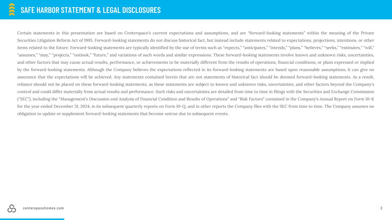 centerspacehomes.com 2 Certain statements in this presentation are based on Centerspace’s current expectations and assumptions, and are “forward-looking statements” within the meaning of the Private Securities Litigation Reform Act of 1995. Forward-looking statements do not discuss historical fact, but instead include statements related to expectations, projections, intentions, or other items related to the future. Forward-looking statements are typically identified by the use of terms such as “expects,” “anticipates,” “intends,” “plans,” “believes,” “seeks,” “estimates,” “will,” “assumes,” “may,” “projects,” “outlook,” “future,” and variations of such words and similar expressions. These forward-looking statements involve known and unknown risks, uncertainties, and other factors that may cause actual results, performance, or achievements to be materially different from the results of operations, financial conditions, or plans expressed or implied by the forward-looking statements. Although the Company believes the expectations reflected in its forward-looking statements are based upon reasonable assumptions, it can give no assurance that the expectations will be achieved. Any statements contained herein that are not statements of historical fact should be deemed forward-looking statements. As a result, reliance should not be placed on these forward-looking statements, as these statements are subject to known and unknown risks, uncertainties, and other factors beyond the Company's control and could differ materially from actual results and performance. Such risks and uncertainties are detailed from time to time in filings with the Securities and Exchange Commission (“SEC”), including the “Management’s Discussion and Analysis of Financial Condition and Results of Operations” and “Risk Factors” contained in the Company’s Annual Report on Form 10-K for the year ended December 31, 2024, in its subsequent quarterly reports on Form 10-Q, and in other reports the Company files with the SEC from time to time. The Company assumes no obligation to update or supplement forward-looking statements that become untrue due to subsequent events. SAFE HARBOR STATEMENT & LEGAL DISCLOSURES