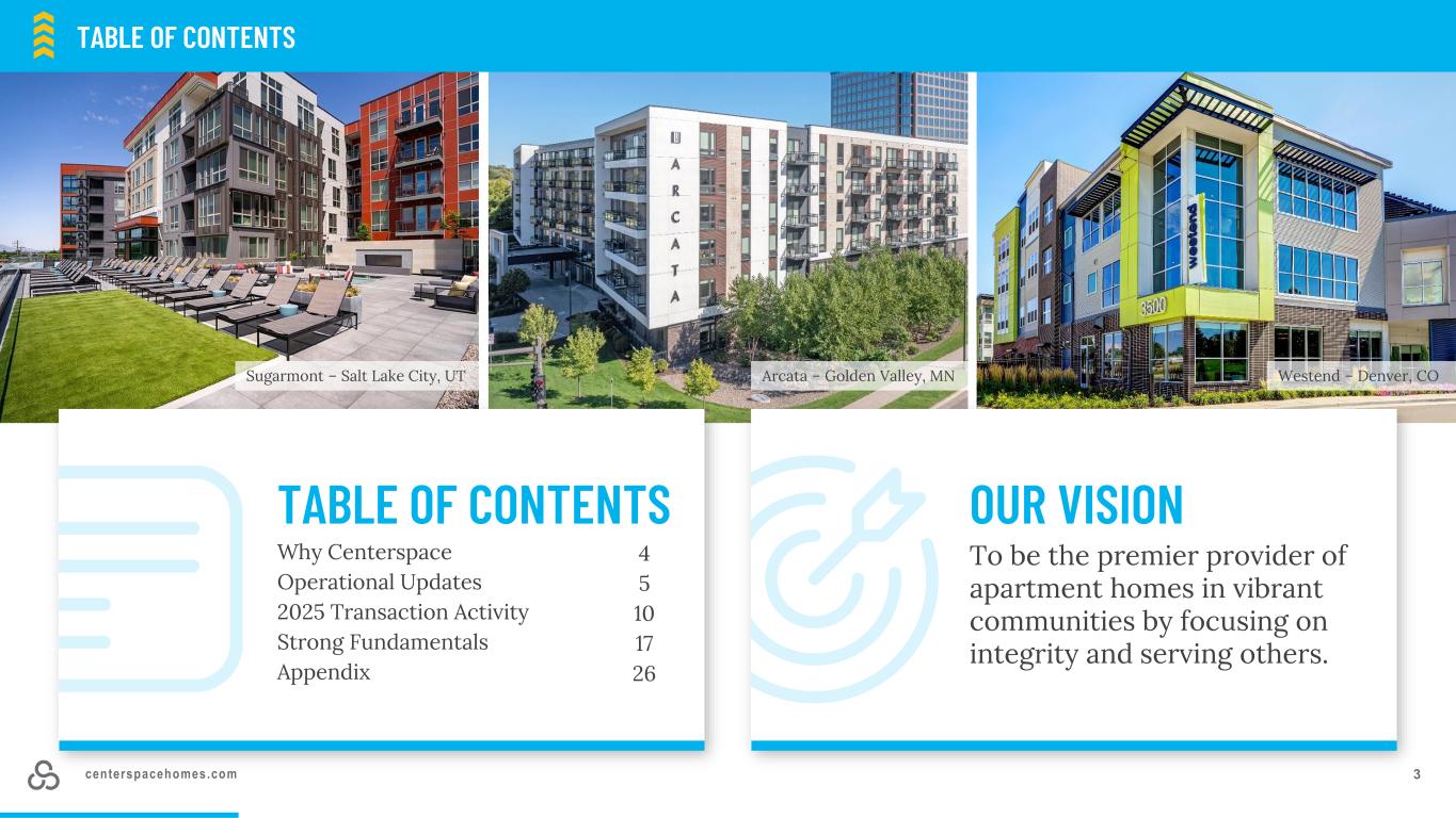 OUR VISION To be the premier provider of apartment homes in vibrant communities by focusing on integrity and serving others. TABLE OF CONTENTS Why Centerspace Operational Updates 2025 Transaction Activity Strong Fundamentals Appendix Arcata – Golden Valley, MN TABLE OF CONTENTS 3centerspacehomes.com Sugarmont – Salt Lake City, UT Westend – Denver, CO 4 5 10 17 26