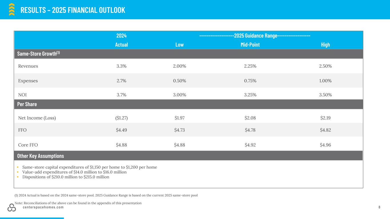 centerspacehomes.com 31 RECONCILIATION TO NON-GAAP MEASURESRECONCILIATION TO NON-GAAP MEASURES Reconciliation of Net Income Available to Common Shareholders to FFO and Core FFO The following table presents reconciliations of net income available to common shareholders to FFO and Core FFO, which are non-GAAP financial measures described in greater detail under “Non-GAAP Financial Measures and Other Terms.” They should not be considered as alternatives to net income or any other GAAP measurement of performance, but rather should be considered as an additional, supplemental measure. FFO and Core FFO also do not represent cash generated from operating activities in accordance with GAAP, nor are they indicative of funds available to fund all cash needs, including the ability to service indebtedness or make distributions to shareholders. The outlook and projections provided below are based on current expectations and are forward-looking statements under applicable U.S. federal securities laws. Updated Outlook Nine Months Ended 12 Months Ended (in thousands) 9/30/2025 12/31/2025 12/31/2025 Actual Low High Net income available to common shareholders $ 35,534 $ 33,563 $ 36,970 Noncontrolling interests - Operating Partnership and Series E preferred units 6,071 5,464 6,507 Depreciation and amortization 83,807 109,160 108,960 Less depreciation - non real estate (252) (350) (300) Less depreciation - partially owned entities (43) (43) (43) Impairment of real estate investments 23,219 23,219 23,219 Gain on sale of real estate (79,531) (80,000) (82,500) Less gain on sale of real estate - partially owned entities 2,251 2,251 2,251 Distributions to Series D preferred unitholders 429 486 486 FFO applicable to common shares and Units - diluted $ 71,485 $ 93,750 $ 95,550 Adjustments to Core FFO: Non-cash casualty loss 308 450 400 Loss on extinguishment of debt 3 225 200 Interest rate swap amortization 407 407 407 Amortization of assumed debt 1,365 1,950 1,900 Other miscellaneous items (503) (250) (200) Core FFO applicable to common shares and Units - diluted $ 73,065 $ 96,532 $ 98,257 Net income per share - diluted $ 2.12 $ 1.97 $ 2.19 FFO per share - diluted $ 3.60 $ 4.73 $ 4.82 Core FFO per share - diluted $ 3.68 $ 4.88 $ 4.96