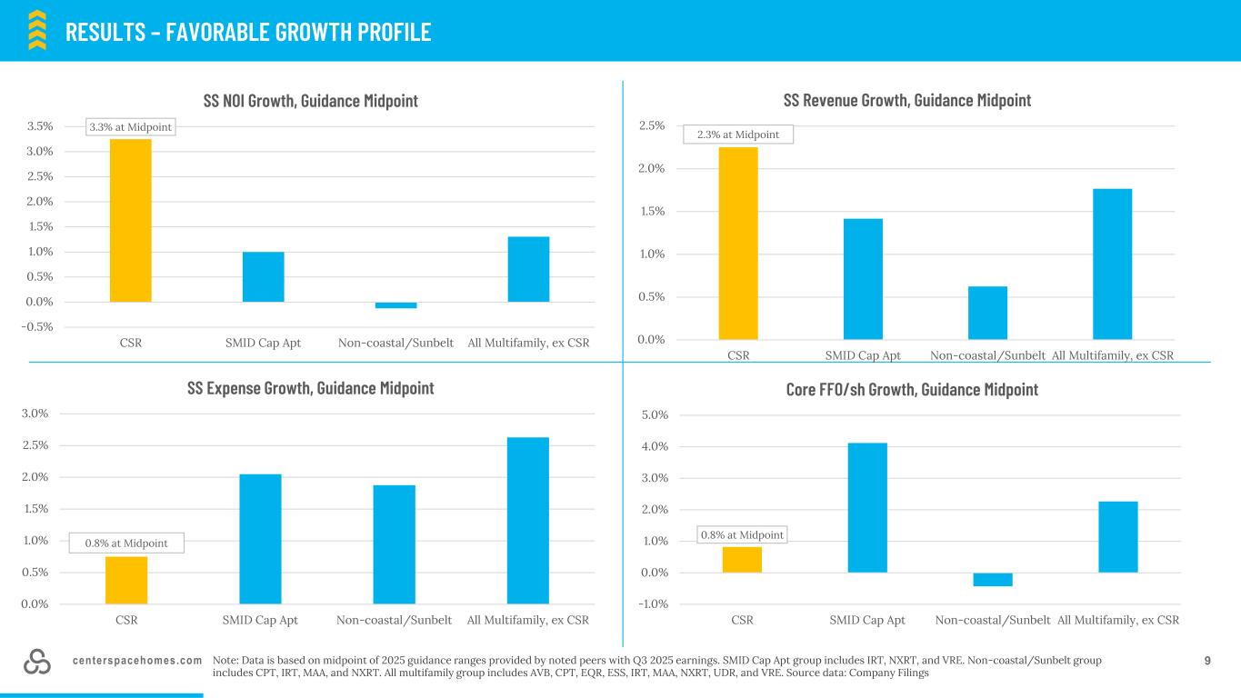 centerspacehomes.com RESULTS – FAVORABLE GROWTH PROFILE 9Note: Data is based on midpoint of 2025 guidance ranges provided by noted peers with Q3 2025 earnings. SMID Cap Apt group includes IRT, NXRT, and VRE. Non-coastal/Sunbelt group includes CPT, IRT, MAA, and NXRT. All multifamily group includes AVB, CPT, EQR, ESS, IRT, MAA, NXRT, UDR, and VRE. Source data: Company Filings 0.8% at Midpoint -1.0% 0.0% 1.0% 2.0% 3.0% 4.0% 5.0% CSR SMID Cap Apt Non-coastal/Sunbelt All Multifamily, ex CSR Core FFO/sh Growth, Guidance Midpoint 3.3% at Midpoint -0.5% 0.0% 0.5% 1.0% 1.5% 2.0% 2.5% 3.0% 3.5% CSR SMID Cap Apt Non-coastal/Sunbelt All Multifamily, ex CSR SS NOI Growth, Guidance Midpoint 2.3% at Midpoint 0.0% 0.5% 1.0% 1.5% 2.0% 2.5% CSR SMID Cap Apt Non-coastal/Sunbelt All Multifamily, ex CSR SS Revenue Growth, Guidance Midpoint 0.8% at Midpoint 0.0% 0.5% 1.0% 1.5% 2.0% 2.5% 3.0% CSR SMID Cap Apt Non-coastal/Sunbelt All Multifamily, ex CSR SS Expense Growth, Guidance Midpoint