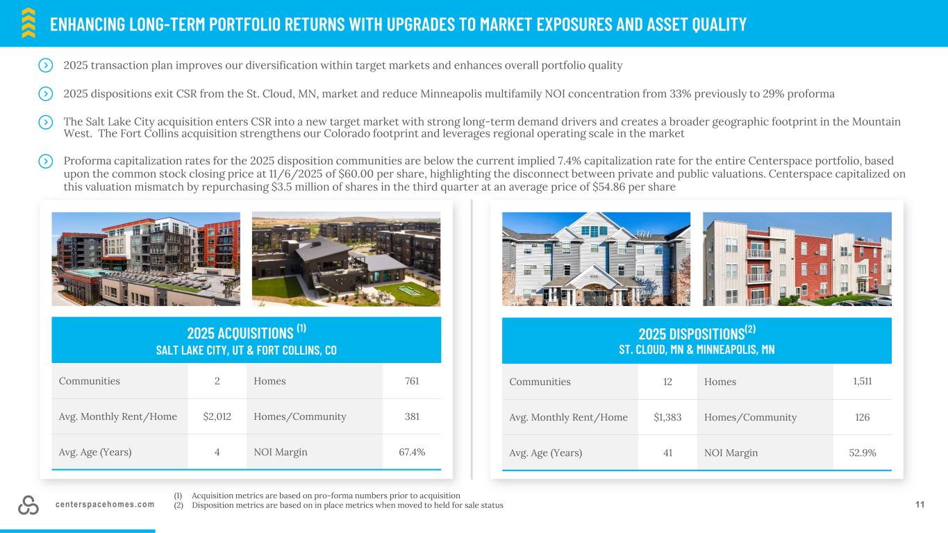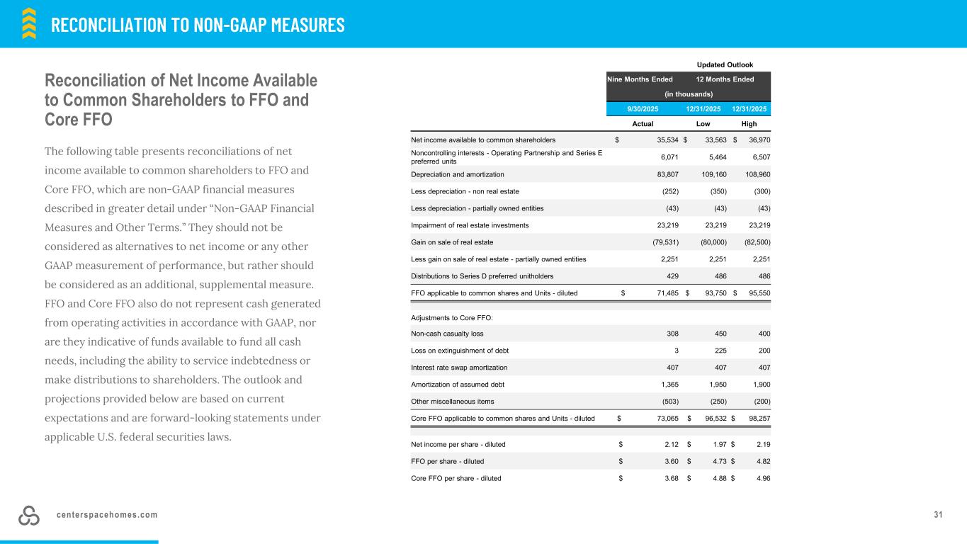 centerspacehomes.com 30 RECONCILIATION TO NON-GAAP MEASURES UpdatedRECONCILIATION TO NON-GAAP MEASURESRECONCILIATION TO NON-GAAP MEASURES (1) Consists of (gain) loss on investments and one-time professional fees. (in thousands) Three Months Ended Nine Months Ended 9/30/2025 6/30/2025 3/31/2025 12/31/2024 9/30/2024 9/30/2025 9/30/2024 Funds from Operations Net income (loss) available to common shareholders $ 53,783 $ (14,515) $ (3,734) $ (5,079) $ (6,166) $ 35,534 $ ( 14,581) Adjustments: Noncontrolling interests – Operating Partnership and Series E preferred units 9,197 (2,483) (643) (900) (1,095) 6,071 (2,735) Depreciation and amortization 29,056 27,097 27,654 27,640 26,084 83,807 78,810 Less depreciation – non real estate (85) (84) (83) (79) (81) (252) (248) Less depreciation – partially owned entities - (21) (22) (24) (25) (43) (74) Impairment of real estate investments 8,676 14,543 - - - 23,219 - (Gain) loss on sale of real estate (79,531) - - - - (79,531) 577 Less gain on sale of real estate - partially owned entities 2,251 - - - - 2,251 - FFO applicable to common shares and Units $ 23,347 $ 24,537 $ 23,172 $ 21,558 $ 18,717 $ 71,056 $ 61,749 Adjustments to Core FFO: Non-cash casualty loss (recovery) (123) 149 282 2,171 (632) 308 261 Loss on extinguishment of debt 3 - - - - 3 - Interest rate swap amortization 58 174 175 171 171 407 542 Amortization of assumed debt 530 418 417 417 263 1,365 789 Redemption of preferred shares - - - - 3,511 - 3,511 Other miscellaneous items(1) (455) 19 (67) (454) (61) (503) (35) Core FFO applicable to common shares and Units $ 23,360 $ 25,297 $ 23,979 $ 23,863 $ 21,969 $ 72,636 $ 66,817 FFO applicable to common shares and Units $ 23,347 $ 24,537 $ 23,172 $ 21,558 $ 18,717 $ 71,056 $ 61,749 Distributions to Series D preferred unitholders 109 160 160 160 160 429 480 FFO applicable to common shares and Units - diluted $ 23,456 $ 24,697 $ 23,332 $ 21,718 $ 18,877 $ 71,485 $ 62,229 Core FFO applicable to common shares and Units $ 23,360 $ 25,297 $ 23,979 $ 23,863 $ 21,969 $ 72,636 $ 66,817 Distributions to Series D preferred unitholders 109 160 160 160 160 429 480 Core FFO applicable to common shares and Units - diluted $ 23,469 $ 25,457 $ 24,139 $ 24,023 $ 22,129 $ 73,065 $ 67,297 Per Share Data Net income (loss) per share and Unit - diluted $ 3.19 $ (0.87) $ (0.22) $ (0.31) $ (0.40) $ 2.12 $ (0.96) FFO per share and Unit - diluted $ 1.19 $ 1.24 $ 1.17 $ 1.09 $ 1.01 $ 3.60 $ 3.40 Core FFO per share and Unit - diluted $ 1.19 $ 1.28 $ 1.21 $ 1.21 $ 1.18 $ 3.68 $ 3.68 Weighted average shares - basic for net income (loss) 16,726 16,741 16,727 16,583 15,528 16,731 15,143 Effect of operating partnership Units for FFO and Core FFO 966 971 980 939 818 972 836 Effect of Series D preferred units for FFO and Core FFO 155 228 228 228 228 204 228 Effect of Series E preferred units for FFO and Core FFO 1,898 1,905 1,906 2,033 2,053 1,903 2,064 Effect of dilutive restricted stock units and stock options for FFO and Core FFO 26 25 35 56 49 25 32 Weighted average shares and Units for FFO and Core FFO - diluted 19,771 19,870 19,876 19,839 18,676 19,835 18,303