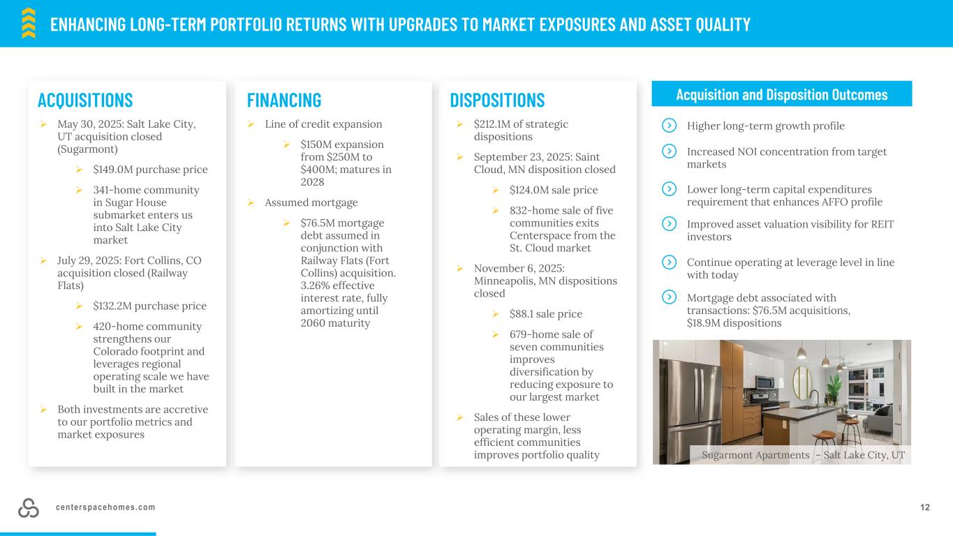 centerspacehomes.com ENHANCING LONG-TERM PORTFOLIO RETURNS WITH UPGRADES TO MARKET EXPOSURES AND ASSET QUALITY 11 2025 DISPOSITIONS(2) ST. CLOUD, MN & MINNEAPOLIS, MN Communities 12 Homes 1,511 Avg. Monthly Rent/Home $1,383 Homes/Community 126 Avg. Age (Years) 41 NOI Margin 52.9% 2025 ACQUISITIONS (1) SALT LAKE CITY, UT & FORT COLLINS, CO Communities 2 Homes 761 Avg. Monthly Rent/Home $2,012 Homes/Community 381 Avg. Age (Years) 4 NOI Margin 67.4% The Salt Lake City acquisition enters CSR into a new target market with strong long-term demand drivers and creates a broader geographic footprint in the Mountain West. The Fort Collins acquisition strengthens our Colorado footprint and leverages regional operating scale in the market Proforma capitalization rates for the 2025 disposition communities are below the current implied 7.4% capitalization rate for the entire Centerspace portfolio, based upon the common stock closing price at 11/6/2025 of $60.00 per share, highlighting the disconnect between private and public valuations. Centerspace capitalized on this valuation mismatch by repurchasing $3.5 million of shares in the third quarter at an average price of $54.86 per share 2025 dispositions exit CSR from the St. Cloud, MN, market and reduce Minneapolis multifamily NOI concentration from 33% previously to 29% proforma 2025 transaction plan improves our diversification within target markets and enhances overall portfolio quality (1) Acquisition metrics are based on pro-forma numbers prior to acquisition (2) Disposition metrics are based on in place metrics when moved to held for sale status