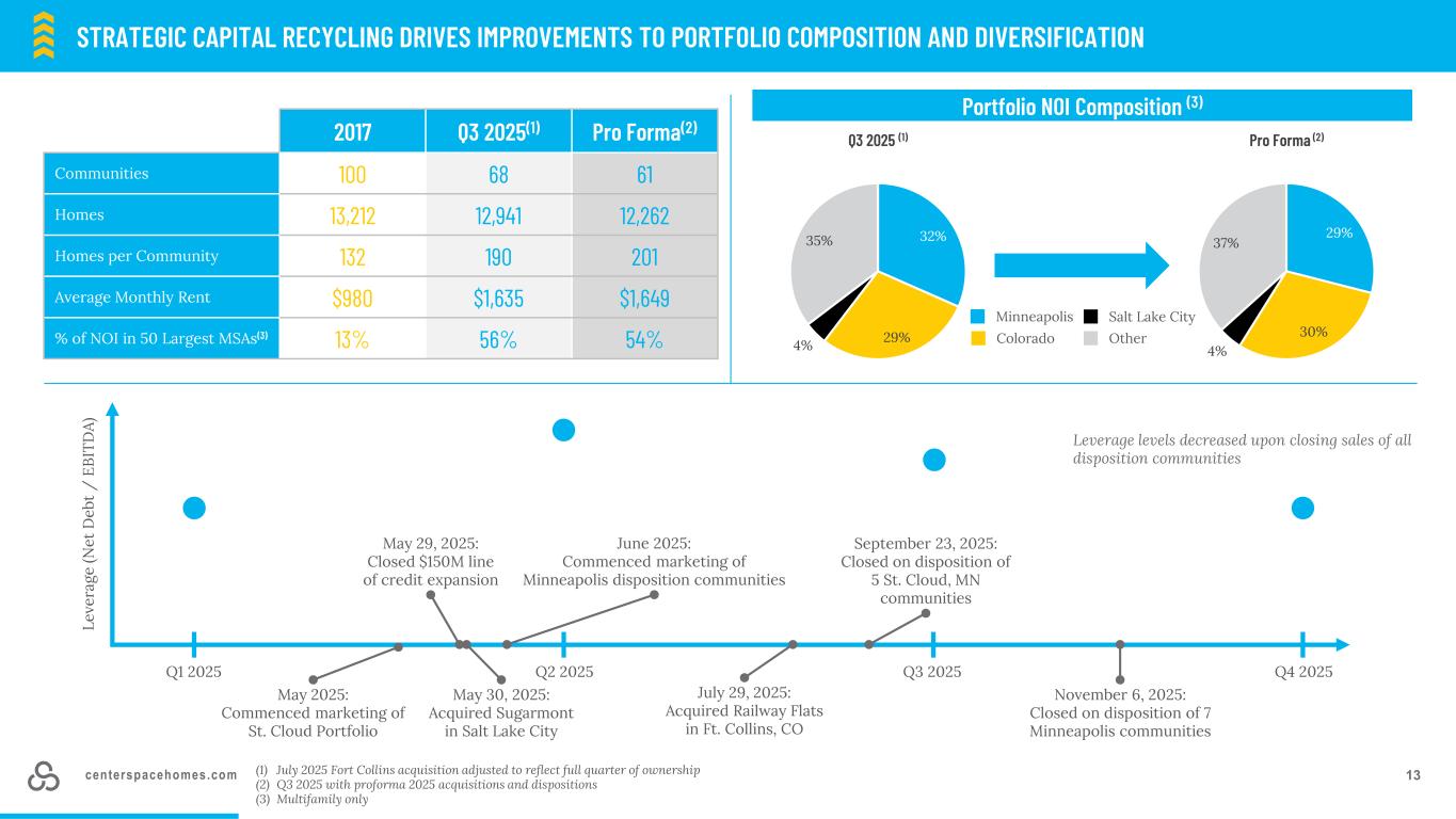 centerspacehomes.com 12 ➢ $212.1M of strategic dispositions ➢ September 23, 2025: Saint Cloud, MN disposition closed ➢ $124.0M sale price ➢ 832-home sale of five communities exits Centerspace from the St. Cloud market ➢ November 6, 2025: Minneapolis, MN dispositions closed ➢ $88.1 sale price ➢ 679-home sale of seven communities improves diversification by reducing exposure to our largest market ➢ Sales of these lower operating margin, less efficient communities improves portfolio quality DISPOSITIONSACQUISITIONS FINANCING ➢ May 30, 2025: Salt Lake City, UT acquisition closed (Sugarmont) ➢ $149.0M purchase price ➢ 341-home community in Sugar House submarket enters us into Salt Lake City market ➢ July 29, 2025: Fort Collins, CO acquisition closed (Railway Flats) ➢ $132.2M purchase price ➢ 420-home community strengthens our Colorado footprint and leverages regional operating scale we have built in the market ➢ Both investments are accretive to our portfolio metrics and market exposures ➢ Line of credit expansion ➢ $150M expansion from $250M to $400M; matures in 2028 ➢ Assumed mortgage ➢ $76.5M mortgage debt assumed in conjunction with Railway Flats (Fort Collins) acquisition. 3.26% effective interest rate, fully amortizing until 2060 maturity Acquisition and Disposition Outcomes Sugarmont Apartments – Salt Lake City, UT Higher long-term growth profile ENHANCING LONG-TERM PORTFOLIO RETURNS WITH UPGRADES TO MARKET EXPOSURES AND ASSET QUALITY Increased NOI concentration from target markets Lower long-term capital expenditures requirement that enhances AFFO profile Improved asset valuation visibility for REIT investors Continue operating at leverage level in line with today Mortgage debt associated with transactions: $76.5M acquisitions, $18.9M dispositions
