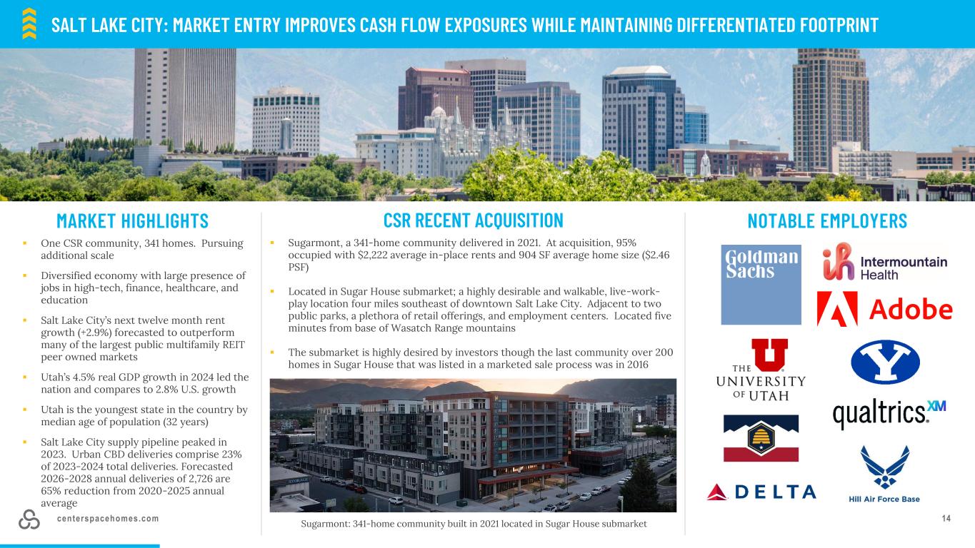 centerspacehomes.com 13 2017 Q3 2025(1) Pro Forma(2) Communities 100 68 61 Homes 13,212 12,941 12,262 Homes per Community 132 190 201 Average Monthly Rent $980 $1,635 $1,649 % of NOI in 50 Largest MSAs(3) 13% 56% 54% (1) July 2025 Fort Collins acquisition adjusted to reflect full quarter of ownership (2) Q3 2025 with proforma 2025 acquisitions and dispositions (3) Multifamily only STRATEGIC CAPITAL RECYCLING DRIVES IMPROVEMENTS TO PORTFOLIO COMPOSITION AND DIVERSIFICATION Minneapolis Colorado Salt Lake City Other Portfolio NOI Composition (3) May 29, 2025: Closed $150M line of credit expansion May 30, 2025: Acquired Sugarmont in Salt Lake City September 23, 2025: Closed on disposition of 5 St. Cloud, MN communities November 6, 2025: Closed on disposition of 7 Minneapolis communities July 29, 2025: Acquired Railway Flats in Ft. Collins, CO May 2025: Commenced marketing of St. Cloud Portfolio June 2025: Commenced marketing of Minneapolis disposition communities Q1 2025 Q3 2025Q2 2025 Le ve ra ge (N et D eb t / E BI T D A) Q4 2025 Leverage levels decreased upon closing sales of all disposition communities 32% 29%4% 35% Q3 2025 (1) 29% 30% 4% 37% Pro Forma (2)