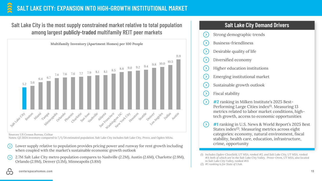 centerspacehomes.com 14 SALT LAKE CITY: MARKET ENTRY IMPROVES CASH FLOW EXPOSURES WHILE MAINTAINING DIFFERENTIATED FOOTPRINT ▪ One CSR community, 341 homes. Pursuing additional scale ▪ Diversified economy with large presence of jobs in high-tech, finance, healthcare, and education ▪ Salt Lake City’s next twelve month rent growth (+2.9%) forecasted to outperform many of the largest public multifamily REIT peer owned markets ▪ Utah’s 4.5% real GDP growth in 2024 led the nation and compares to 2.8% U.S. growth ▪ Utah is the youngest state in the country by median age of population (32 years) ▪ Salt Lake City supply pipeline peaked in 2023. Urban CBD deliveries comprise 23% of 2023-2024 total deliveries. Forecasted 2026-2028 annual deliveries of 2,726 are 65% reduction from 2020-2025 annual average MARKET HIGHLIGHTS NOTABLE EMPLOYERSCSR RECENT ACQUISITION ▪ Sugarmont, a 341-home community delivered in 2021. At acquisition, 95% occupied with $2,222 average in-place rents and 904 SF average home size ($2.46 PSF) ▪ Located in Sugar House submarket; a highly desirable and walkable, live-work- play location four miles southeast of downtown Salt Lake City. Adjacent to two public parks, a plethora of retail offerings, and employment centers. Located five minutes from base of Wasatch Range mountains ▪ The submarket is highly desired by investors though the last community over 200 homes in Sugar House that was listed in a marketed sale process was in 2016 Sugarmont: 341-home community built in 2021 located in Sugar House submarket