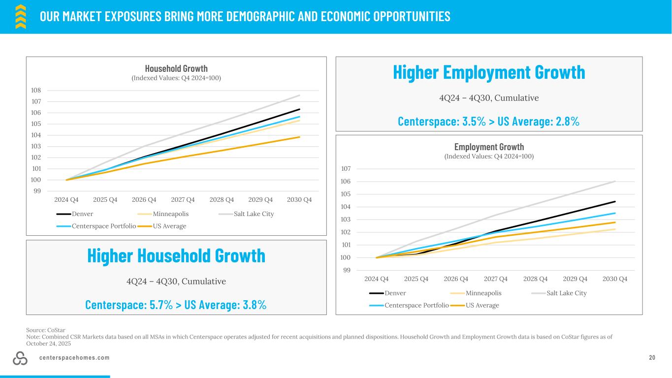 centerspacehomes.com 19 MARKET SELECTION LEADS TO BETTER FULL CYCLE PERFORMANCE AND LESS VOLATILITY Centerspace’s stable Midwest and Mountain West markets have led to both greater average growth and lower volatility from quarter-to-quarter than multifamily peers Higher Growth Long Term Quarterly Average Y/Y SS NOI Growth 1Q20 – 3Q25 Centerspace: 5.4% > Peer Average: 4.1% Lower Volatility Quarterly Standard Deviation of Y/Y SS NOI Growth 1Q20 – 3Q25 Centerspace: 3.7% < Peer Average: 6.9% Note: Data is based on year-over-year same-store NOI growth, as reported in each quarter. Graphed numbers represent trailing four quarter average. Data is not adjusted for changes to same-store pools that have occurred since filings. Peer group includes AVB, CPT, ELME, EQR, ESS, IRT, MAA, NXRT, UDR, and VRE. Source data: Company Filings -10% -5% 0% 5% 10% 15% 20% 4Q20 1Q21 2Q21 3Q21 4Q21 1Q22 2Q22 3Q22 4Q22 1Q23 2Q23 3Q23 4Q23 1Q24 2Q24 3Q24 4Q24 1Q25 2Q25 3Q25 Same Store NOI Growth CSR T4Q Avg Peer T4Q Average CSR Quarterly Avg Peer Quarterly Avg