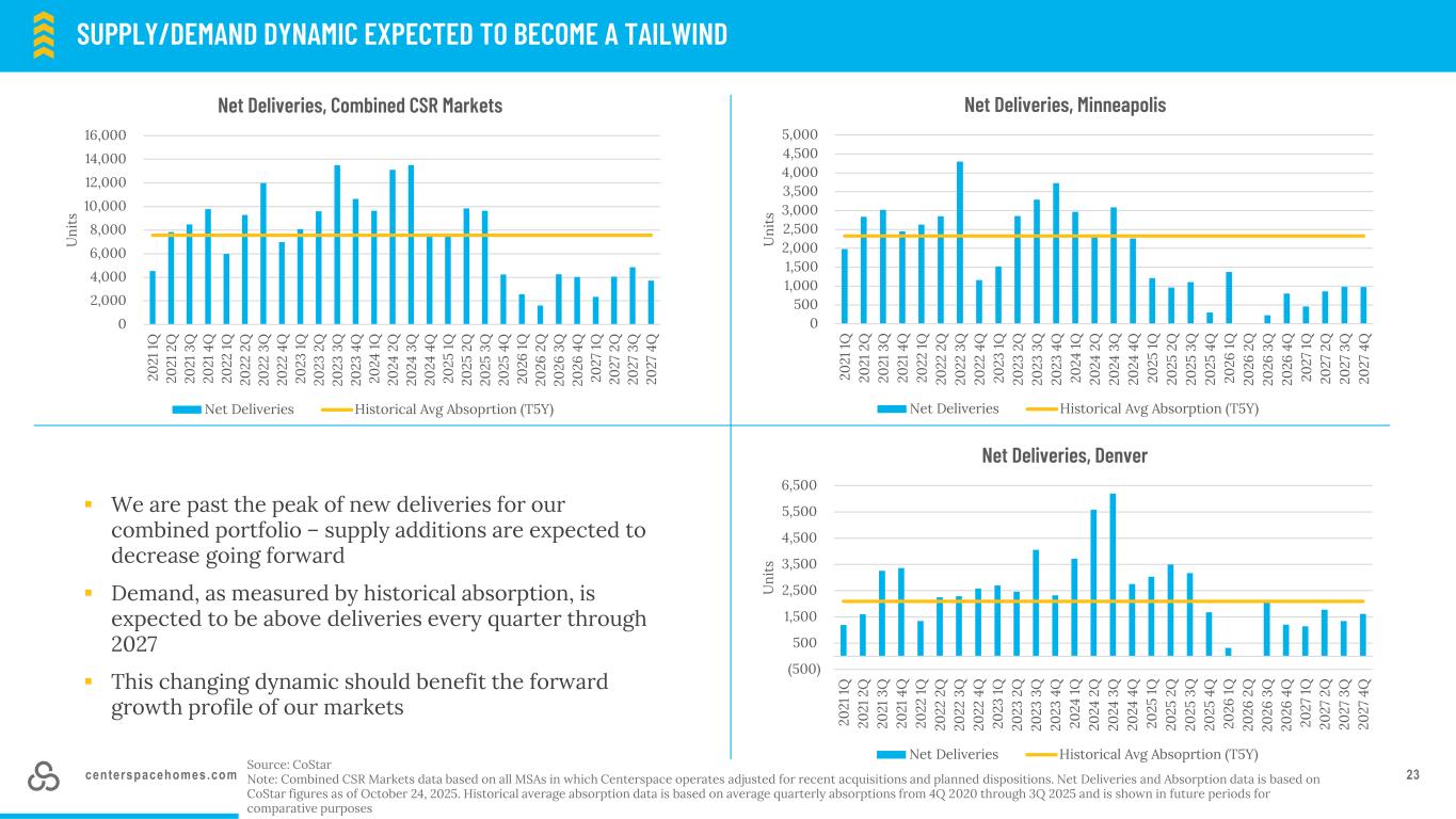 centerspacehomes.com 23 SUPPLY/DEMAND DYNAMIC EXPECTED TO BECOME A TAILWIND Source: CoStar Note: Combined CSR Markets data based on all MSAs in which Centerspace operates adjusted for recent acquisitions and planned dispositions. Net Deliveries and Absorption data is based on CoStar figures as of October 24, 2025. Historical average absorption data is based on average quarterly absorptions from 4Q 2020 through 3Q 2025 and is shown in future periods for comparative purposes ▪ We are past the peak of new deliveries for our combined portfolio – supply additions are expected to decrease going forward ▪ Demand, as measured by historical absorption, is expected to be above deliveries every quarter through 2027 ▪ This changing dynamic should benefit the forward growth profile of our markets 0 2,000 4,000 6,000 8,000 10,000 12,000 14,000 16,000 20 21 1Q 20 21 2 Q 20 21 3 Q 20 21 4 Q 20 22 1Q 20 22 2 Q 20 22 3 Q 20 22 4 Q 20 23 1Q 20 23 2 Q 20 23 3 Q 20 23 4 Q 20 24 1Q 20 24 2 Q 20 24 3 Q 20 24 4 Q 20 25 1Q 20 25 2 Q 20 25 3 Q 20 25 4 Q 20 26 1Q 20 26 2 Q 20 26 3 Q 20 26 4 Q 20 27 1Q 20 27 2 Q 20 27 3 Q 20 27 4 Q U ni ts Net Deliveries, Combined CSR Markets Net Deliveries Historical Avg Absoprtion (T5Y) 0 500 1,000 1,500 2,000 2,500 3,000 3,500 4,000 4,500 5,000 20 21 1Q 20 21 2 Q 20 21 3 Q 20 21 4 Q 20 22 1Q 20 22 2 Q 20 22 3 Q 20 22 4 Q 20 23 1Q 20 23 2 Q 20 23 3 Q 20 23 4 Q 20 24 1Q 20 24 2 Q 20 24 3 Q 20 24 4 Q 20 25 1Q 20 25 2 Q 20 25 3 Q 20 25 4 Q 20 26 1Q 20 26 2 Q 20 26 3 Q 20 26 4 Q 20 27 1Q 20 27 2 Q 20 27 3 Q 20 27 4 Q U ni ts Net Deliveries, Minneapolis Net Deliveries Historical Avg Absorption (T5Y) (500) 500 1,500 2,500 3,500 4,500 5,500 6,500 20 21 1Q 20 21 2 Q 20 21 3 Q 20 21 4 Q 20 22 1Q 20 22 2 Q 20 22 3 Q 20 22 4 Q 20 23 1Q 20 23 2 Q 20 23 3 Q 20 23 4 Q 20 24 1Q 20 24 2 Q 20 24 3 Q 20 24 4 Q 20 25 1Q 20 25 2 Q 20 25 3 Q 20 25 4 Q 20 26 1Q 20 26 2 Q 20 26 3 Q 20 26 4 Q 20 27 1Q 20 27 2 Q 20 27 3 Q 20 27 4 Q U ni ts Net Deliveries, Denver Net Deliveries Historical Avg Absoprtion (T5Y)