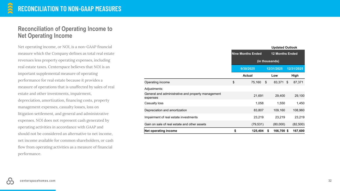 centerspacehomes.com 32 RECONCILIATION TO NON-GAAP MEASURESRECONCILIATION TO NON-GAAP MEASURES Reconciliation of Operating Income to Net Operating Income Net operating income, or NOI, is a non-GAAP financial measure which the Company defines as total real estate revenues less property operating expenses, including real estate taxes. Centerspace believes that NOI is an important supplemental measure of operating performance for real estate because it provides a measure of operations that is unaffected by sales of real estate and other investments, impairment, depreciation, amortization, financing costs, property management expenses, casualty losses, loss on litigation settlement, and general and administrative expenses. NOI does not represent cash generated by operating activities in accordance with GAAP and should not be considered an alternative to net income, net income available for common shareholders, or cash flow from operating activities as a measure of financial performance. Updated Outlook Nine Months Ended 12 Months Ended (in thousands) 9/30/2025 12/31/2025 12/31/2025 Actual Low High Operating income $ 75,160 $ 83,371 $ 87,371 Adjustments: General and administrative and property management expenses 21,691 29,400 29,100 Casualty loss 1,058 1,550 1,450 Depreciation and amortization 83,807 109,160 108,960 Impairment of real estate investments 23,219 23,219 23,219 Gain on sale of real estate and other assets (79,531) (80,000) (82,500) Net operating income $ 125,404 $ 166,700 $ 167,600