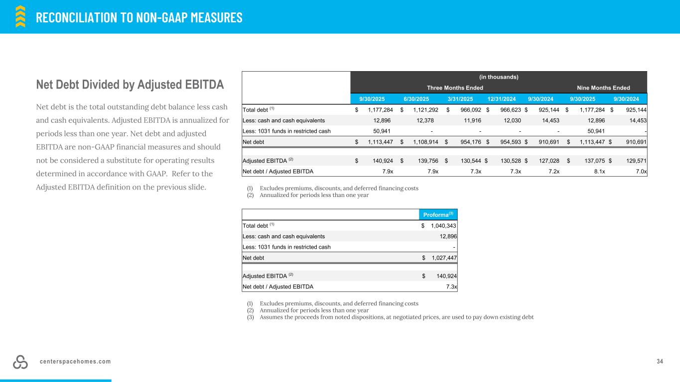 centerspacehomes.com 33 Reconciliation of Net Income (Loss) Available to Common Shareholders to Adjusted EBITDA Adjusted EBITDA is earnings before interest, taxes, depreciation, amortization, gain or loss on sale of real estate and other investments, impairment of real estate investments, gain or loss on extinguishment of debt, gain or loss from involuntary conversion, and other non-routine items or items not considered core to business operations. The company considers Adjusted EBITDA to be an appropriate supplemental performance measure because it permits investors to view income from operations without the effect of depreciation, financing costs, or non-operating gains and losses. Adjusted EBITDA is a non-GAAP financial measure and should not be considered a substitute for operating results determined in accordance with GAAP. RECONCILIATION TO NON-GAAP MEASURESRECONCILIATION TO NON-GAAP MEASURES (1) Consists of (gain) loss on investments and one-time professional fees (in thousands) Three Months Ended Nine Months Ended 9/30/2025 6/30/2025 3/31/2025 12/31/2024 9/30/2024 9/30/2025 9/30/2024 Adjusted EBITDA Net income (loss) attributable to controlling interests $ 53,783 $ (14,515) $ (3,734) $ (5,079) $ (1,048) $ 35,534 $ (6,249) Adjustments: Distributions to Series D preferred unitholders 109 160 160 160 160 429 480 Noncontrolling interests – Operating Partnership and Series E preferred units 9,197 (2,483) (643) (900) (1,095) 6,071 (2,735) Income (loss) before noncontrolling interests – Operating Partnership and Series E preferred units $ 63,089 $ (16,838) $ (4,217) $ (5,819) $ (1,983) $ 42,034 $ (8,504) Adjustments: Interest expense 12,989 10,719 9,622 9,782 8,932 33,330 27,443 Loss on extinguishment of debt 3 - - - - 3 - Depreciation and amortization related to real estate investments 29,056 27,076 27,632 27,616 26,059 83,764 78,736 Impairment of real estate investments 8,676 14,543 - - - 23,219 - Non-cash casualty loss (recovery) (123) 149 282 2,171 (632) 308 261 Interest income (724) (729) (616) (662) (558) (2,069) (1,300) (Gain) loss on sale of real estate (77,280) - - - - (77,280) 577 Other miscellaneous items(1) (455) 19 (67) (455) (61) (503) (35) Adjusted EBITDA $ 35,231 $ 34,939 $ 32,636 $ 32,633 $ 31,757 $ 102,806 $ 97,178