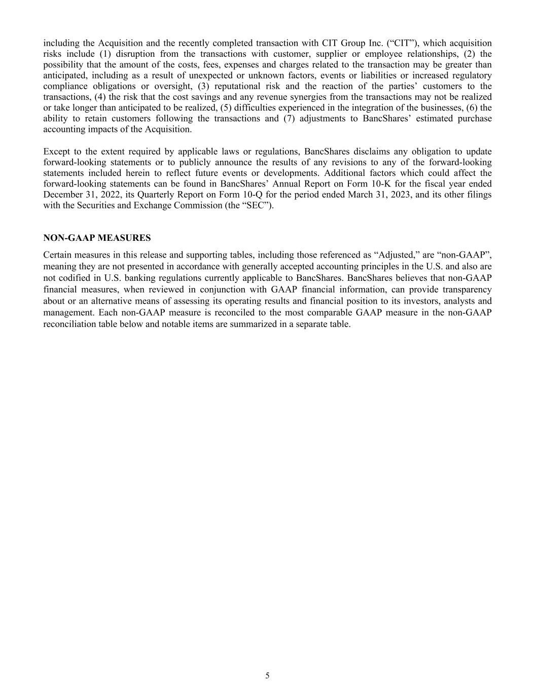 39 2Q23 1Q23 4Q22 3Q22 2Q22 INTEREST INCOME Interest and fees on loans $ 2,353 $ 1,017 $ 892 $ 785 $ 655 Interest on investment securities 120 107 92 90 89 Interest on deposits at banks 480 87 56 31 13 Total interest income 2,953 1,211 1,040 906 757 INTEREST EXPENSE Deposits 575 288 176 78 42 Borrowings 417 73 62 33 15 Total interest expense 992 361 238 111 57 Net interest income 1,961 850 802 795 700 Provision for credit losses 151 783 79 60 42 Net interest income after provision for credit losses 1,810 67 723 735 658 NONINTEREST INCOME Rental income on operating lease equipment 238 233 224 219 213 Fee income and other service charges 69 47 43 41 37 Client investment fees 52 2 — — — Wealth management services 51 40 35 35 37 International fees 32 4 3 3 2 Service charges on deposit accounts 44 24 22 21 28 Factoring commissions 20 19 26 24 27 Cardholder services, net 41 21 26 25 26 Merchant services, net 14 10 8 8 9 Insurance commissions 14 13 13 11 11 Realized loss on sale of investment securities available for sale, net — (14) — — — Fair value adjustment on marketable equity securities, net (10) (9) 2 (2) (6) Bank-owned life insurance 2 5 7 8 9 Gain on sale of leasing equipment, net 4 4 2 2 5 Gain on acquisition 55 9,824 — — — Gain on extinguishment of debt — — — 1 — Other noninterest income 32 36 18 37 26 Total noninterest income 658 10,259 429 433 424 NONINTEREST EXPENSE Depreciation on operating lease equipment 91 89 88 87 89 Maintenance and other operating lease expenses 56 56 47 52 47 Salaries and benefits 775 420 354 353 345 Net occupancy expense 64 50 48 47 48 Equipment expense 133 58 55 55 54 Professional fees 21 11 11 11 11 Third-party processing fees 54 30 26 27 26 FDIC insurance expense 22 18 5 5 9 Marketing expense 41 15 21 15 9 Acquisition-related expenses 205 28 29 33 34 Intangible asset amortization 18 5 6 5 6 Other noninterest expense 92 75 70 70 67 Total noninterest expense 1,572 855 760 760 745 Income before income taxes 896 9,471 392 408 337 Income tax (benefit) expense 214 (47) 135 93 82 Net income $ 682 $ 9,518 $ 257 $ 315 $ 255 Preferred stock dividends $ 15 $ 14 $ 14 $ 12 $ 17 Net income available to common stockholders $ 667 $ 9,504 $ 243 $ 303 $ 238 BancShares Income Statements (unaudited) ($ in millions)