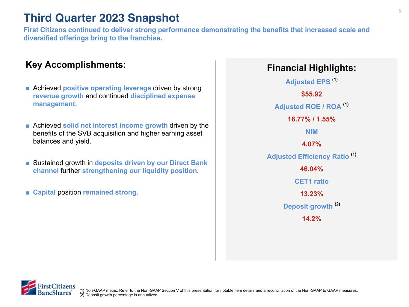 3 Forward Looking Statements This presentation contains “forward-looking statements” within the meaning of the Private Securities Litigation Reform Act of 1995 regarding the financial condition, results of operations, business plans, asset quality, future performance and other strategic goals of First Citizens BancShares, Inc. ("BancShares“). Words such as “anticipates,” “believes,” “estimates,” “expects,” “predicts,” “forecasts,” “intends,” “plans,” “projects,” “targets,” “designed,” “could,” “may,” “should,” “will,” “potential,” “continue”, “aims” or other similar words and expressions are intended to identify these forward-looking statements. These forward-looking statements are based on BancShares’ current expectations and assumptions regarding BancShares’ business, the economy, and other future conditions. Because forward-looking statements relate to future results and occurrences, they are subject to inherent risks, uncertainties, changes in circumstances and other risk factors that are difficult to predict. Many possible events or factors could affect BancShares’ future financial results and performance and could cause the actual results, performance or achievements of BancShares to differ materially from any anticipated results expressed or implied by such forward-looking statements. Such risks and uncertainties include, among others, general competitive, economic, political, geopolitical events (including conflicts in Ukraine, Israel and the Gaza Strip) and market conditions, including changes in competitive pressures among financial institutions and the impacts related to or resulting from recent bank failures and other volatility, the financial success or changing conditions or strategies of BancShares’ vendors or clients, including changes in demand for deposits, loans and other financial services, fluctuations in interest rates, changes in the quality or composition of BancShares’ loan or investment portfolio, actions of government regulators, including the recent and projected interest rate hikes by the Board of Governors of the Federal Reserve Board (the “Federal Reserve”), changes to estimates of future costs and benefits of actions taken by BancShares, BancShares’ ability to maintain adequate sources of funding and liquidity, the potential impact of decisions by the Federal Reserve on BancShares’ capital plans, adverse developments with respect to U.S. or global economic conditions, including the significant turbulence in the capital or financial markets, the impact of the current inflationary environment, the impact of implementation and compliance with current or proposed laws, regulations and regulatory interpretations, including the interagency proposed rule on regulatory capital, along with the risk that such laws, regulations and regulatory interpretations may change, the availability of capital and personnel, and the failure to realize the anticipated benefits of BancShares’ previous acquisition transactions, including the previously completed FDIC- assisted transaction with Silicon Valley Bridge Bank, N.A. (“SVB acquisition”) and the previously completed transaction with CIT Group Inc. (“CIT”), which acquisition risks include (1) disruption from the transactions with client, supplier or employee relationships, (2) the possibility that the amount of the costs, fees, expenses and charges related to the transactions may be greater than anticipated, including as a result of unexpected or unknown factors, events or liabilities or increased regulatory compliance obligations or oversight, (3) reputational risk and the reaction of the parties’ clients to the transactions, (4) the risk that the cost savings and any revenue synergies from the transactions may not be realized or take longer than anticipated to be realized, (5) difficulties experienced in completing the integration of the businesses, (6) the ability to retain clients following the transactions and (7) adjustments to BancShares’ estimated purchase accounting impacts of the SVB acquisition. Except to the extent required by applicable laws or regulations, BancShares disclaims any obligation to update forward-looking statements or to publicly announce the results of any revisions to any of the forward-looking statements included herein to reflect future events or developments. Additional factors which could affect the forward-looking statements can be found in BancShares’ Annual Report on Form 10-K for the fiscal year ended December 31, 2022, its Quarterly Reports on Form 10-Q for the periods ended March 31, 2023, June 30, 2023, and its other filings with the Securities and Exchange Commission (the “SEC”). Non-GAAP Measures Certain measures in this presentation are “Non-GAAP,” meaning they are not presented in accordance with generally accepted accounting principles in the U.S. and also are not codified in U.S. banking regulations currently applicable to BancShares. BancShares believes that Non-GAAP financial measures, when reviewed in conjunction with GAAP financial information, can provide transparency about or an alternative means of assessing its operating results and financial position to its investors, analysts and management. Certain financial results referenced as “Adjusted” in this presentation exclude notable items. The Adjusted financial measures are Non-GAAP. Refer to Section V of this presentation for a reconciliation of Non-GAAP measures to the most directly comparable GAAP measure. Reclassifications In certain instances, amounts reported in prior period consolidated financial statements have been reclassified to conform to the current financial statement presentation. Such reclassifications had no effect on previously reported stockholders’ equity or net income. The methodologies that we use to allocate items among our segments are dynamic and may be updated periodically to