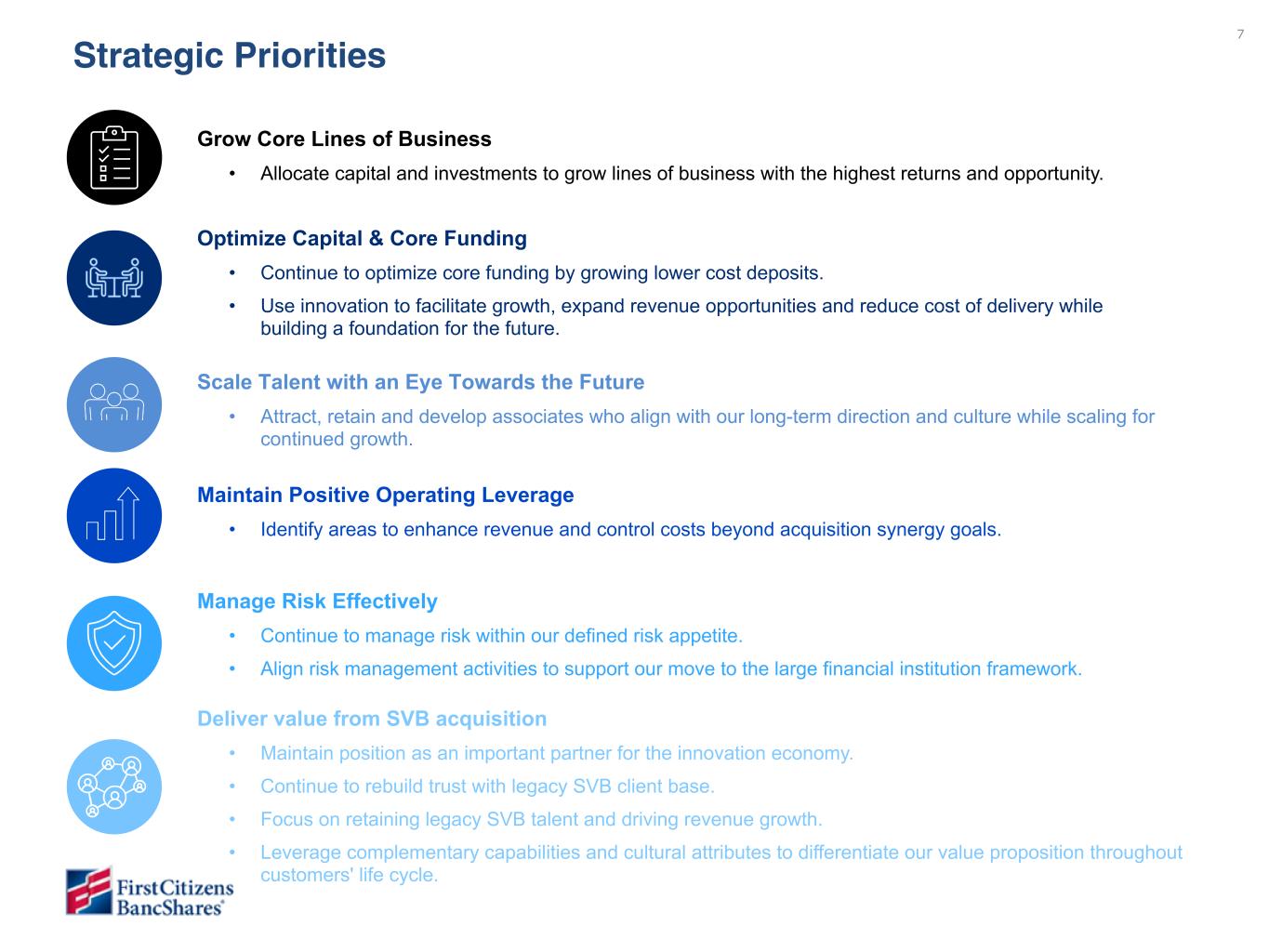 7 Strategic Priorities Grow Core Lines of Business • Allocate capital and investments to grow lines of business with the highest returns and opportunity. Scale Talent with an Eye Towards the Future • Attract, retain and develop associates who align with our long-term direction and culture while scaling for continued growth. Optimize Capital & Core Funding • Continue to optimize core funding by growing lower cost deposits. • Use innovation to facilitate growth, expand revenue opportunities and reduce cost of delivery while building a foundation for the future. Manage Risk Effectively • Continue to manage risk within our defined risk appetite. • Align risk management activities to support our move to the large financial institution framework. Maintain Positive Operating Leverage • Identify areas to enhance revenue and control costs beyond acquisition synergy goals. Deliver value from SVB acquisition • Maintain position as an important partner for the innovation economy. • Continue to rebuild trust with legacy SVB client base. • Focus on retaining legacy SVB talent and driving revenue growth. • Leverage complementary capabilities and cultural attributes to differentiate our value proposition throughout customers' life cycle.