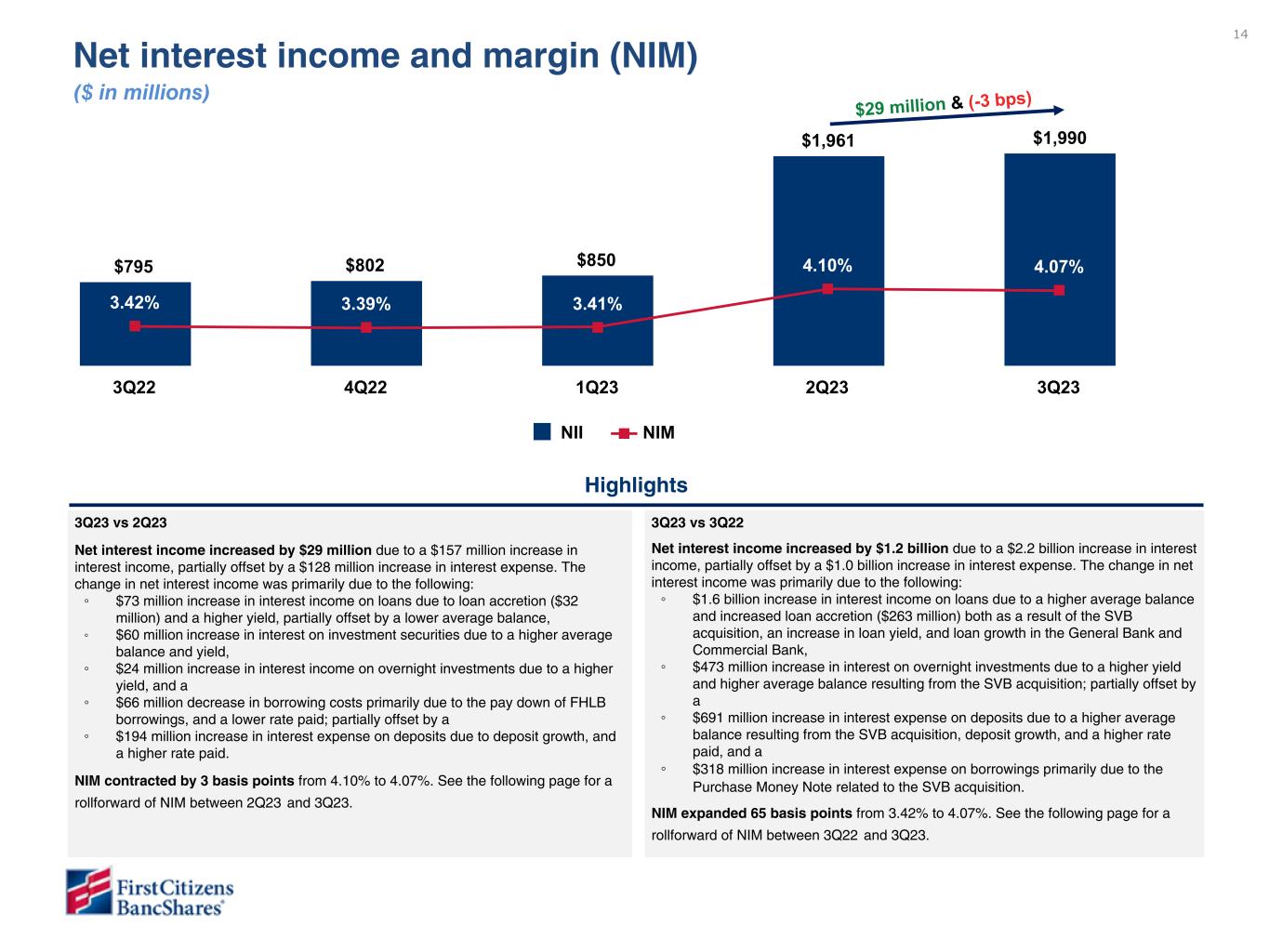 13 Reported Increase (decrease) QTD 2Q23 3Q22 3Q23 2Q23 3Q22 $ % $ % Net interest income $ 1,990 $ 1,961 $ 795 $ 29 1.5 % $ 1,195 150.4 % Noninterest income 615 658 433 (43) (6.6) 182 42.2 Net revenue 2,605 2,619 1,228 (14) (0.5) 1,377 112.1 Noninterest expense 1,416 1,572 760 (156) (10.0) 656 86.4 Pre-provision net revenue 1,189 1,047 468 142 13.6 721 154.1 Provision for credit losses 192 151 60 41 27.3 132 226.2 Income before income taxes 997 896 408 101 11.4 589 144.2 Income taxes 245 214 93 31 14.8 152 162.6 Net income 752 682 315 70 10.3 437 138.7 Preferred stock dividends 15 15 12 0 3.8 3 24.9 Net income available to common stockholders $ 737 $ 667 $ 303 $ 70 10.5 % $ 434 143.3 % Adjustment for notable items 3Q23 2Q23 3Q22 Noninterest income $ (147) $ (196) $ (145) Noninterest expense (284) (370) (183) Provision for credit losses 3 1 — Income taxes 58 75 15 Adjusted (Non-GAAP) Increase (decrease) QTD 2Q23 3Q22 3Q23 2Q23 3Q22 $ % $ % Net interest income $ 1,990 $ 1,961 $ 795 $ 29 1.5 % $ 1,195 150.4 % Noninterest income 468 462 288 6 1.3 180 62.4 Net revenue 2,458 2,423 1,083 35 1.4 1,375 127.0 Noninterest expense 1,132 1,202 577 (70) (5.9) 555 96.0 Pre-provision net revenue 1,326 1,221 506 105 8.6 820 162.1 Provision for credit losses 195 152 60 43 28.5 135 230.8 Income before income taxes 1,131 1,069 446 62 5.9 685 153.4 Income taxes 303 289 108 14 4.9 195 181.6 Net income 828 780 338 48 6.3 490 144.4 Preferred stock dividends 15 15 12 0 3.8 3 24.9 Net income available to common stockholders $ 813 $ 765 $ 326 $ 48 6.3 % $ 487 148.9 % Quarter-to-Date Earnings Highlights ($ in millions) Note – Adjusted amounts exclude notable items. Refer to the Non-GAAP Section V of this presentation for notable item details and a reconciliation of the Non-GAAP to GAAP measures.