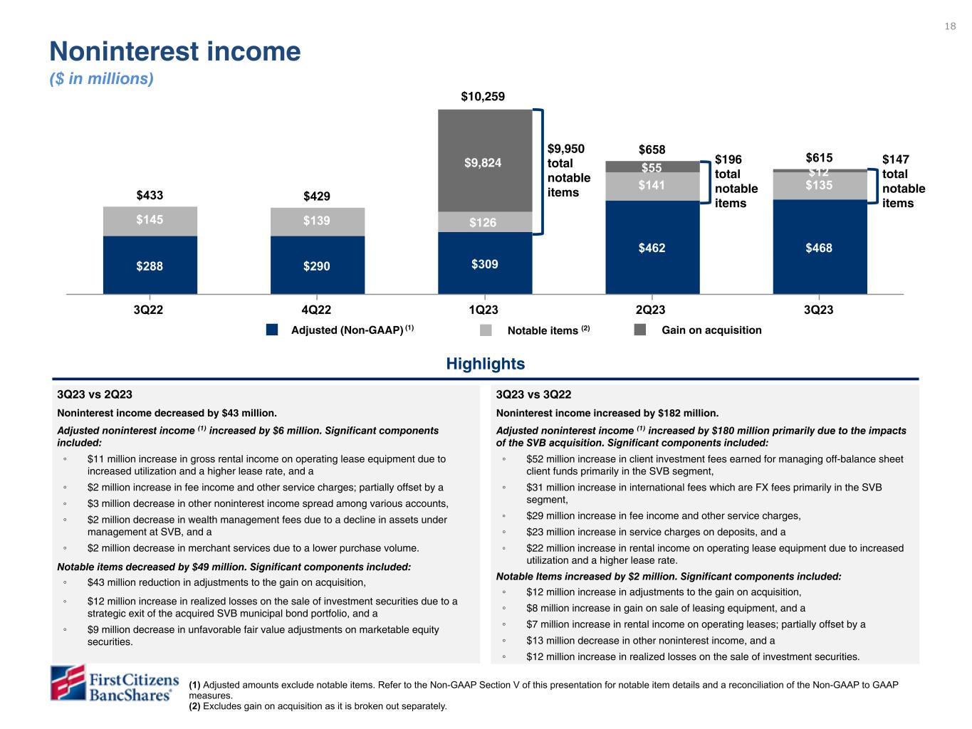 18 $433 $429 $658 $615 $288 $290 $309 $462 $468 $145 $139 $141 $135 $55 $12 3Q22 4Q22 1Q23 2Q23 3Q23 $295 $135 1Q23 SVB contribution $1,940 $2,136 $996 $1,141 $944 $995 YTD Dec 21 YTD Dec 22 3Q23 vs 2Q23 Noninterest income decreased by $43 million. Adjusted noninterest income (1) increased by $6 million. Significant components included: ◦ $11 million increase in gross rental income on operating lease equipment due to increased utilization and a higher lease rate, and a ◦ $2 million increase in fee income and other service charges; partially offset by a ◦ $3 million decrease in other noninterest income spread among various accounts, ◦ $2 million decrease in wealth management fees due to a decline in assets under management at SVB, and a ◦ $2 million decrease in merchant services due to a lower purchase volume. Notable items decreased by $49 million. Significant components included: ◦ $43 million reduction in adjustments to the gain on acquisition, ◦ $12 million increase in realized losses on the sale of investment securities due to a strategic exit of the acquired SVB municipal bond portfolio, and a ◦ $9 million decrease in unfavorable fair value adjustments on marketable equity securities. YTD22 vs YTD21 Noninterest income increased $196 million. Significant components of the change were: ◦ Rental income on operating leases increased $91 million due to the same reasons as in the linked quarter. Expenses on operating lease equipment declined $16 million resulting in a $107 million increase in adjusted rental income. ◦ Cardholder services income, net increased $15 million due to higher volume and fee income and other service charges increased $14 million, primarily due to higher capital markets and portfolio servicing fees. ◦ Wealth management services increased $13 million due to increased brokerage transactions and higher assets under management. ◦ Other noninterest income increased $63 million spread among various line items, including a $431 million bargain purchase gain, partially offset by a $147 million decline in investment gains and a $188 million decline in gains on asset and loan sales. Highlights Noninterest income ($ in millions) Core: ### increase 3Q23 vs 3Q22 Noninterest income increased by $182 million. Adjusted noninterest income (1) increased by $180 million primarily due to the impacts of the SVB acquisition. Significant components included: ◦ $52 million increase in client investment fees earned for managing off-balance sheet client funds primarily in the SVB segment, ◦ $31 million increase in international fees which are FX fees primarily in the SVB segment, ◦ $29 million increase in fee income and other service charges, ◦ $23 million increase in service charges on deposits, and a ◦ $22 million increase in rental income on operating lease equipment due to increased utilization and a higher lease rate. Notable Items increased by $2 million. Significant components included: ◦ $12 million increase in adjustments to the gain on acquisition, ◦ $8 million increase in gain on sale of leasing equipment, and a ◦ $7 million increase in rental income on operating leases; partially offset by a ◦ $13 million decrease in other noninterest income, and a ◦ $12 million increase in realized losses on the sale of investment securities. (1) Adjusted amounts exclude notable items. Refer to the Non-GAAP Section V of this presentation for notable item details and a reconciliation of the Non-GAAP to GAAP measures. (2) Excludes gain on acquisition as it is broken out separately. $10,259 $126 Adjusted (Non-GAAP) (1) Notable items (2) Gain on acquisition $9,824 $145 - total notable items $147 - total notable items $468 - total adjusted (Non-GAAP) (1) $9,950 total notable items $196 total notable items $147 total notable items