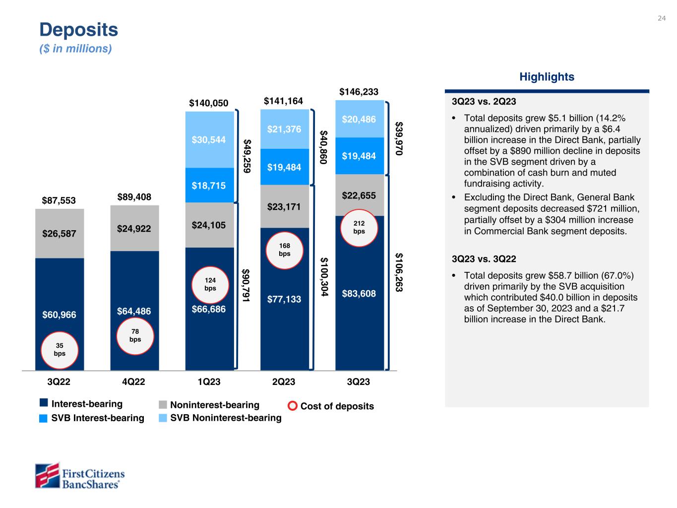 22 $69,790 $70,781 $138,288 $133,015 $133,202 $41,693 $43,212 $43,632 $44,978 $46,077 $28,097 $27,569 $28,485 $29,234 $30,261 $66,171 $58,803 $56,864 General Bank Commercial Bank SVB Yield on Loans 3Q22 4Q22 1Q23 2Q23 3Q23 Highlights 3Q23 vs 2Q23 • Total loans increased $187 million driven primarily by a $1.1 billion increase in the General Bank segment and a $1.0 billion increase in the Commercial Bank segment, partially offset by a $1.9 billion decline in the SVB segment related to Global Fund Banking. • The General Bank growth of $1.1 billion (9.7% annualized) was driven primarily by business and commercial loans while the $1.0 billion (14.3% annualized) growth in the Commercial Bank was broad-based given strong performance in many of our industry verticals and seasonal factoring volumes. 3Q23 vs 3Q22 • Total loans increased $63.4 billion due primarily to the SVB acquisition which contributed $56.9 billion in loans as of September 30, 2023. • General Bank loans grew by $4.4 billion (10.5%) due primarily to business, commercial and mortgage loans. • Commercial Bank loans grew by $2.2 billion (7.8%) due to growth in many of our industry verticals, middle market banking and equipment finance. Loans and Leases ($ in millions) Note – Commercial Bank includes a small amount of Rail loans (less than $100 million in all periods). Rail operating lease assets are not included in the loan totals. 7.07% 5.59% 5.14% 4.63% 7.29% 10.1%