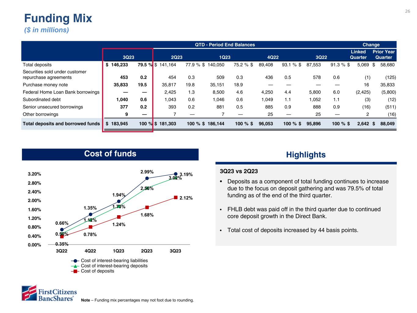 26 0.66% 1.35% 1.94% 2.99% 3.19% 0.50% 1.12% 1.73% 2.56% 3.02% 0.35% 0.78% 1.24% 1.68% 2.12% Cost of interest-bearing liabilities Cost of interest-bearing deposits Cost of deposits 3Q22 4Q22 1Q23 2Q23 3Q23 0.00% 0.40% 0.80% 1.20% 1.60% 2.00% 2.40% 2.80% 3.20% Cost of funds Additional sources of liquidity Categories $ in millions FHLB $ 9,218 FRB 4,203 Line of credit 100 Total $ 13,521 QTD - Period End Balances Change 3Q23 2Q23 1Q23 4Q22 3Q22 Linked Quarter Prior Year Quarter Total deposits $ 146,233 79.5 % $ 141,164 77.9 % $ 140,050 75.2 % $ 89,408 93.1 % $ 87,553 91.3 % $ 5,069 $ 58,680 Securities sold under customer repurchase agreements 453 0.2 454 0.3 509 0.3 436 0.5 578 0.6 (1) (125) Purchase money note 35,833 19.5 35,817 19.8 35,151 18.9 — — — — 16 35,833 Federal Home Loan Bank borrowings — — 2,425 1.3 8,500 4.6 4,250 4.4 5,800 6.0 (2,425) (5,800) Subordinated debt 1,040 0.6 1,043 0.6 1,046 0.6 1,049 1.1 1,052 1.1 (3) (12) Senior unsecured borrowings 377 0.2 393 0.2 881 0.5 885 0.9 888 0.9 (16) (511) Other borrowings 9 — 7 — 7 — 25 — 25 — 2 (16) Total deposits and borrowed funds $ 183,945 100 % $ 181,303 100 % $ 186,144 100 % $ 96,053 100 % $ 95,896 100 % $ 2,642 $ 88,049 Funding Mix ($ in millions) Highlights 3Q23 vs 2Q23 • Deposits as a component of total funding continues to increase due to the focus on deposit gathering and was 79.5% of total funding as of the end of the third quarter. • FHLB debt was paid off in the third quarter due to continued core deposit growth in the Direct Bank. • Total cost of deposits increased by 44 basis points. Note – Funding mix percentages may not foot due to rounding.