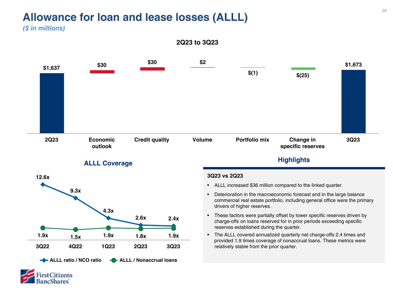 27 $60 $79 $63 $152 $195 Provision for credit losses 3Q22 4Q22 1Q23 2Q23 3Q23 Allowance and Credit Quality Trends ($ in millions) Net charge-offs (NCO) & NCO ratio Adjusted provision for credit losses (1) $18 $24 $50 $157 $176 0.10% 0.14% 0.27% 0.47% 0.53% NCO $ NCO ratio 3Q22 4Q22 1Q23 2Q23 3Q23 $454 $627 $828 $929 $899 0.65% 0.89% 0.60% 0.70% 0.68% Nonaccrual loans Nonaccrual loans to total loans 3Q22 4Q22 1Q23 2Q23 3Q23 Nonaccrual loans / total loans & leases Allowance (ALLL) & ALLL ratio $882 $922 $1,605 $1,637 $1,673 1.26% 1.30% 1.16% 1.23% 1.26% ALLL ALLL ratio 3Q22 4Q22 1Q23 2Q23 3Q23 (1) Adjusted provision for credit losses excludes CECL Day 2 charges and provision (benefit) expense for credit losses on available for sale securities. Refer to the Non-GAAP Section V of this presentation for notable item details and a reconciliation of the Non-GAAP to GAAP measures. SEC calc - Key metrics & ratios SEC Master Income Statement SEC calc SEC calc SEC Master Income Statement Calc on Note 4 SEC Master Income Statement