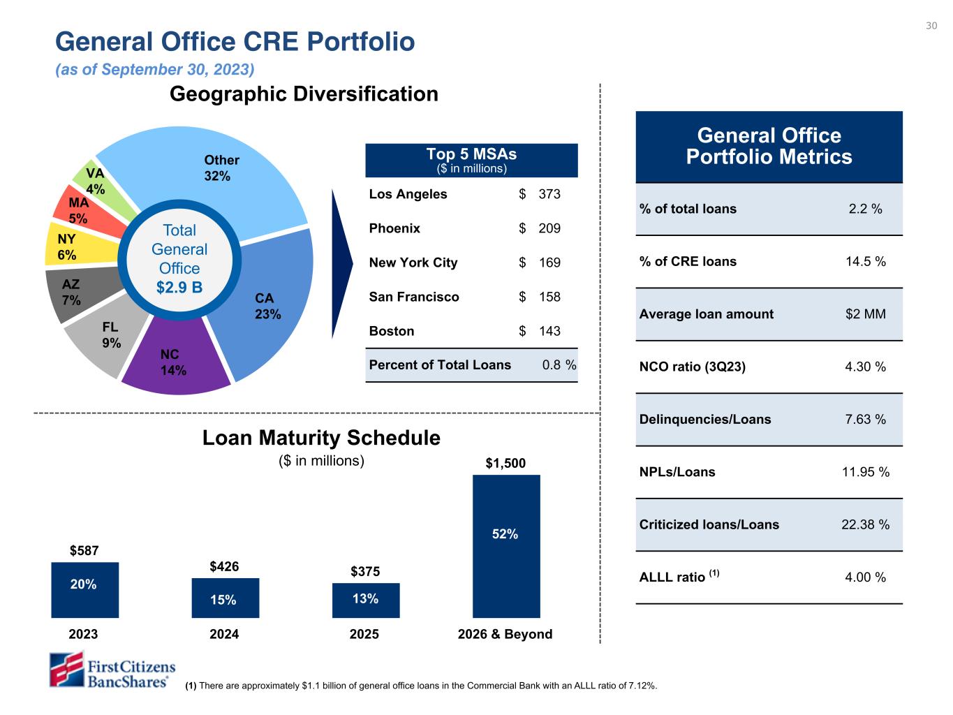 30 General Office CRE Portfolio (as of September 30, 2023) CA 23% NC 14% FL 9% AZ 7% NY 6% MA 5% VA 4% Other 32% Total General Office $2.9 B Geographic Diversification $587 $426 $375 $1,500 2023 2024 2025 2026 & Beyond Loan Maturity Schedule ($ in millions) 20% 15% 13% 52% (1) There are approximately $1.1 billion of general office loans in the Commercial Bank with an ALLL ratio of 7.12%. Top 5 MSAs ($ in millions) Los Angeles $ 373 Phoenix $ 209 New York City $ 169 San Francisco $ 158 Boston $ 143 Percent of Total Loans 0.8 % General Office Portfolio Metrics % of total loans 2.2 % % of CRE loans 14.5 % Average loan amount $2 MM NCO ratio (3Q23) 4.30 % Delinquencies/Loans 7.63 % NPLs/Loans 11.95 % Criticized loans/Loans 22.38 % ALLL ratio (1) 4.00 % CRE and Office Charts - Tim Farmer IR calcs CRE and Office Charts - Tim Farmer IR calc IR calcs CRE and Office Charts - Tim Farmer IR calc IR calc CRE and Office Charts - Tim Farmer IR calc Ask Tim to add current quarter average CRE balance to file IR calc IR calc IR calc ACL Deck? ACL Deck?ACL Deck?