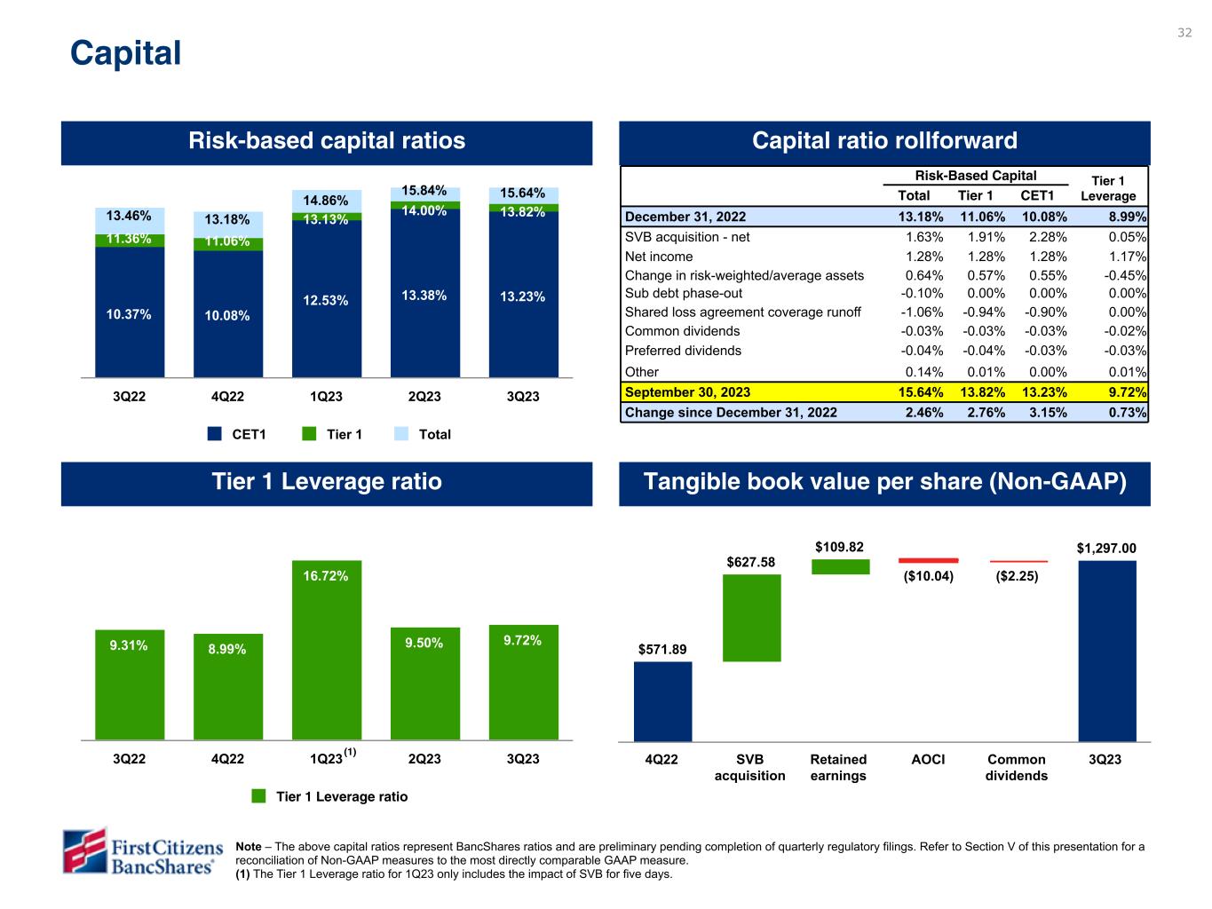 32 9.31% 8.99% 16.72% 9.50% 9.72% Tier 1 Leverage ratio 3Q22 4Q22 1Q23 2Q23 3Q23 Risk-based capital ratios Capital ratio rollforward Tier 1 Leverage ratio Tangible book value per share (Non-GAAP) Capital Risk-Based Capital Tier 1 Leverage Total Tier 1 CET1 December 31, 2022 13.18 % 11.06 % 10.08 % 8.99 % SVB acquisition - net 1.63 % 1.91 % 2.28 % 0.05 % Net income 1.28 % 1.28 % 1.28 % 1.17 % Change in risk-weighted/average assets 0.64 % 0.57 % 0.55 % -0.45 % Sub debt phase-out -0.10 % 0.00 % 0.00 % 0.00 % Shared loss agreement coverage runoff -1.06 % -0.94 % -0.90 % 0.00 % Common dividends -0.03 % -0.03 % -0.03 % -0.02 % Preferred dividends -0.04 % -0.04 % -0.03 % -0.03 % Other 0.14 % 0.01 % 0.00 % 0.01 % September 30, 2023 15.64 % 13.82 % 13.23 % 9.72 % Change since December 31, 2022 2.46 % 2.76 % 3.15 % 0.73 % Note – The above capital ratios represent BancShares ratios and are preliminary pending completion of quarterly regulatory filings. Refer to Section V of this presentation for a reconciliation of Non-GAAP measures to the most directly comparable GAAP measure. (1) The Tier 1 Leverage ratio for 1Q23 only includes the impact of SVB for five days. 10.37% 10.08% 12.53% 13.38% 13.23% 11.36% 11.06% 13.13% 14.00% 13.82%13.46% 13.18% 14.86% 15.84% 15.64% CET1 Tier 1 Total 3Q22 4Q22 1Q23 2Q23 3Q23 $571.89 $627.58 $109.82 ($10.04) ($2.25) $1,297.00 4Q22 SVB acquisition Retained earnings AOCI Common dividends 3Q23(1)