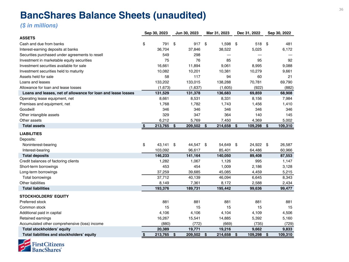 36 Sep 30, 2023 Jun 30, 2023 Mar 31, 2023 Dec 31, 2022 Sep 30, 2022 ASSETS Cash and due from banks $ 791 $ 917 $ 1,598 $ 518 $ 481 Interest-earning deposits at banks 36,704 37,846 38,522 5,025 6,172 Securities purchased under agreements to resell 549 298 — — — Investment in marketable equity securities 75 76 85 95 92 Investment securities available for sale 16,661 11,894 9,061 8,995 9,088 Investment securities held to maturity 10,082 10,201 10,381 10,279 9,661 Assets held for sale 58 117 94 60 21 Loans and leases 133,202 133,015 138,288 70,781 69,790 Allowance for loan and lease losses (1,673) (1,637) (1,605) (922) (882) Loans and leases, net of allowance for loan and lease losses 131,529 131,378 136,683 69,859 68,908 Operating lease equipment, net 8,661 8,531 8,331 8,156 7,984 Premises and equipment, net 1,768 1,782 1,743 1,456 1,410 Goodwill 346 346 346 346 346 Other intangible assets 329 347 364 140 145 Other assets 6,212 5,769 7,450 4,369 5,002 Total assets $ 213,765 $ 209,502 $ 214,658 $ 109,298 $ 109,310 LIABILITIES Deposits: Noninterest-bearing $ 43,141 $ 44,547 $ 54,649 $ 24,922 $ 26,587 Interest-bearing 103,092 96,617 85,401 64,486 60,966 Total deposits 146,233 141,164 140,050 89,408 87,553 Credit balances of factoring clients 1,282 1,067 1,126 995 1,147 Short-term borrowings 453 454 1,009 2,186 3,128 Long-term borrowings 37,259 39,685 45,085 4,459 5,215 Total borrowings 37,712 40,139 46,094 6,645 8,343 Other liabilities 8,149 7,361 8,172 2,588 2,434 Total liabilities 193,376 189,731 195,442 99,636 99,477 STOCKHOLDERS’ EQUITY Preferred stock 881 881 881 881 881 Common stock 15 15 15 15 15 Additional paid in capital 4,106 4,106 4,104 4,109 4,506 Retained earnings 16,267 15,541 14,885 5,392 5,160 Accumulated other comprehensive (loss) income (880) (772) (669) (735) (729) Total stockholders’ equity 20,389 19,771 19,216 9,662 9,833 Total liabilities and stockholders’ equity $ 213,765 $ 209,502 $ 214,658 $ 109,298 $ 109,310 BancShares Balance Sheets (unaudited) ($ in millions)