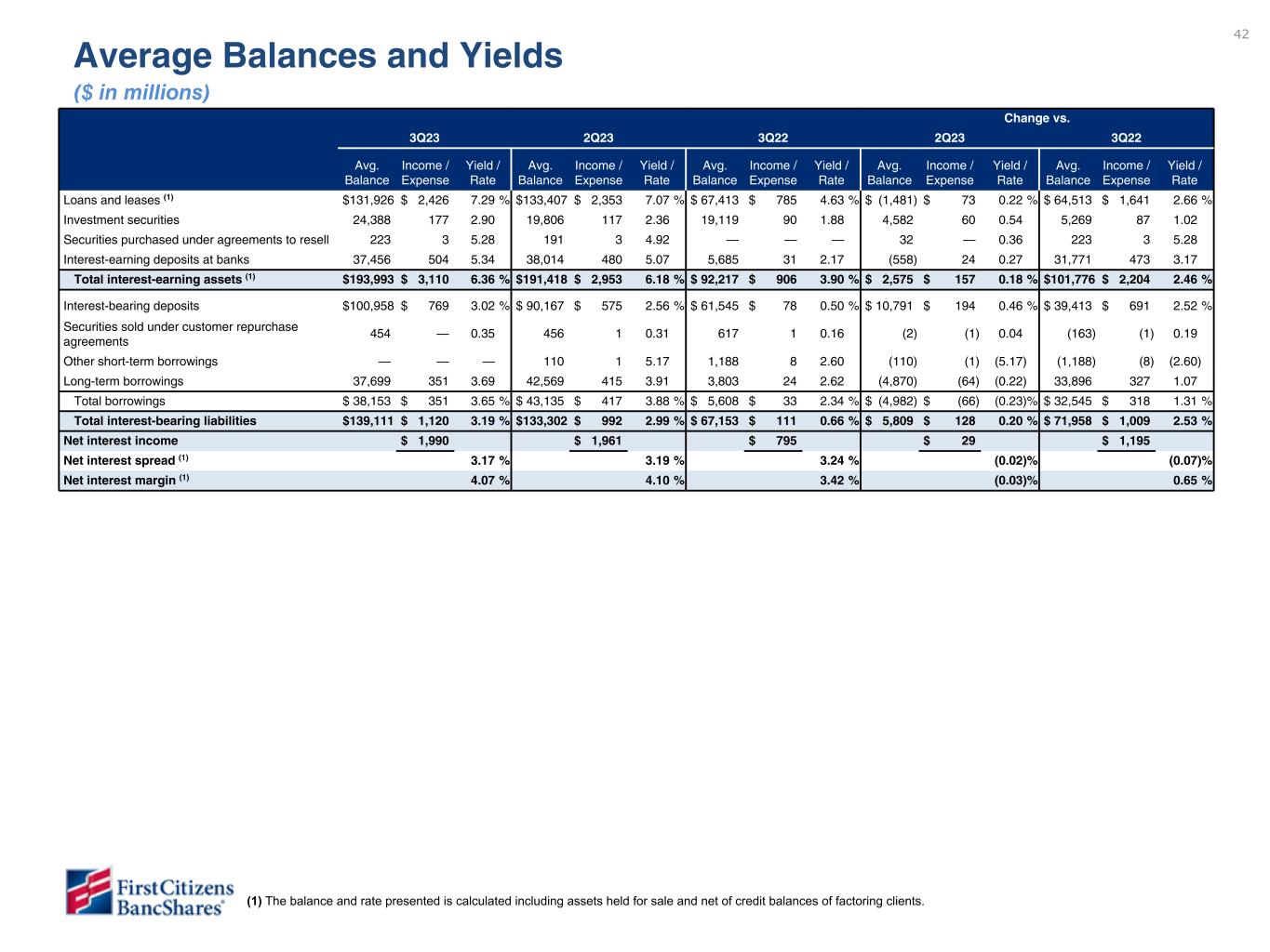 42 Change vs. 3Q23 2Q23 3Q22 2Q23 3Q22 Avg. Balance Income / Expense Yield / Rate Avg. Balance Income / Expense Yield / Rate Avg. Balance Income / Expense Yield / Rate Avg. Balance Income / Expense Yield / Rate Avg. Balance Income / Expense Yield / Rate Loans and leases (1) $ 131,926 $ 2,426 7.29 % $ 133,407 $ 2,353 7.07 % $ 67,413 $ 785 4.63 % $ (1,481) $ 73 0.22 % $ 64,513 $ 1,641 2.66 % Investment securities 24,388 177 2.90 19,806 117 2.36 19,119 90 1.88 4,582 60 0.54 5,269 87 1.02 Securities purchased under agreements to resell 223 3 5.28 191 3 4.92 — — — 32 — 0.36 223 3 5.28 Interest-earning deposits at banks 37,456 504 5.34 38,014 480 5.07 5,685 31 2.17 (558) 24 0.27 31,771 473 3.17 Total interest-earning assets (1) $ 193,993 $ 3,110 6.36 % $ 191,418 $ 2,953 6.18 % $ 92,217 $ 906 3.90 % $ 2,575 $ 157 0.18 % $ 101,776 $ 2,204 2.46 % Interest-bearing deposits $ 100,958 $ 769 3.02 % $ 90,167 $ 575 2.56 % $ 61,545 $ 78 0.50 % $ 10,791 $ 194 0.46 % $ 39,413 $ 691 2.52 % Securities sold under customer repurchase agreements 454 — 0.35 456 1 0.31 617 1 0.16 (2) (1) 0.04 (163) (1) 0.19 Other short-term borrowings — — — 110 1 5.17 1,188 8 2.60 (110) (1) (5.17) (1,188) (8) (2.60) Long-term borrowings 37,699 351 3.69 42,569 415 3.91 3,803 24 2.62 (4,870) (64) (0.22) 33,896 327 1.07 Total borrowings $ 38,153 $ 351 3.65 % $ 43,135 $ 417 3.88 % $ 5,608 $ 33 2.34 % $ (4,982) $ (66) (0.23) % $ 32,545 $ 318 1.31 % Total interest-bearing liabilities $ 139,111 $ 1,120 3.19 % $ 133,302 $ 992 2.99 % $ 67,153 $ 111 0.66 % $ 5,809 $ 128 0.20 % $ 71,958 $ 1,009 2.53 % Net interest income $ 1,990 $ 1,961 $ 795 $ 29 $ 1,195 Net interest spread (1) 3.17 % 3.19 % 3.24 % (0.02) % (0.07) % Net interest margin (1) 4.07 % 4.10 % 3.42 % (0.03) % 0.65 % Change vs. YTD23 YTD22 YTD22 Avg. Balance Income / Expense Yield / Rate Avg. Balance Income / Expense Yield / Rate Avg. Balance Income / Expense Yield / Rate Loans and leases (1) $ 66,634 $ 2,953 4.41 % $ 65,639 $ 2,697 4.09 % $ 995 $ 256 0.32 % Investment securities 19,166 354 1.85 16,110 216 1.32 3,056 138 0.53 Interest-earning deposits at banks 7,726 106 1.38 13,246 17 0.13 (5,520) 89 1.25 Total interest-earning assets (1) $ 93,526 $ 3,413 3.63 % $ 94,995 $ 2,930 3.07 % $ (1,469) $ 483 0.56 % Interest-bearing deposits $ 63,598 $ 335 0.53 % $ 65,295 $ 239 0.37 % $ (1,697) $ 96 0.16 % Securities sold under customer repurchase agreements 590 1 0.19 660 1 0.20 (70) — (0.01) Other short-term borrowings 824 28 3.30 — — — 824 28 3.30 Long-term borrowings 3,882 103 2.64 5,915 249 4.15 (2,033) (146) (1.51) Total borrowings $ 5,296 $ 132 2.47 % $ 6,575 $ 250 3.75 % $ (1,279) $ (118) (1.28) % Total interest-bearing liabilities $ 68,894 $ 467 0.68 % $ 71,870 $ 489 0.68 % $ (2,976) $ (22) — % Net interest income $ 2,946 $ 2,441 $ 505 Net interest spread (1) 2.95 % 2.39 % 0.56 % Net interest margin (1) 3.14 % 2.55 % 0.59 % Average Balances and Yields ($ in millions) (1) The balance and rate presented is calculated including assets held for sale and net of credit balances of factoring clients. YTD not disclosed Q1