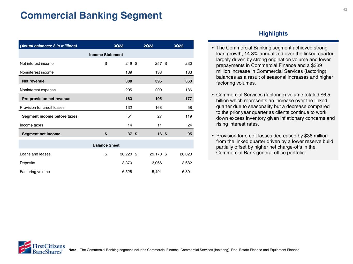 43 Highlights • The Commercial Banking segment achieved strong loan growth, 14.3% annualized over the linked quarter, largely driven by strong origination volume and lower prepayments in Commercial Finance and a $339 million increase in Commercial Services (factoring) balances as a result of seasonal increases and higher factoring volumes. • Commercial Services (factoring) volume totaled $6.5 billion which represents an increase over the linked quarter due to seasonality but a decrease compared to the prior year quarter as clients continue to work down excess inventory given inflationary concerns and rising interest rates. • Provision for credit losses decreased by $36 million from the linked quarter driven by a lower reserve build partially offset by higher net charge-offs in the Commercial Bank general office portfolio. (Actual balances; $ in millions) 3Q23 2Q23 3Q22 Income Statement Net interest income $ 249 $ 257 $ 230 Noninterest income 139 138 133 Net revenue 388 395 363 Noninterest expense 205 200 186 Pre-provision net revenue 183 195 177 Provision for credit losses 132 168 58 Segment income before taxes 51 27 119 Income taxes 14 11 24 Segment net income $ 37 $ 16 $ 95 Balance Sheet Loans and leases $ 30,220 $ 29,170 $ 28,023 Deposits 3,370 3,066 3,682 Factoring volume 6,528 5,491 6,801 Commercial Banking Segment Note – The Commercial Banking segment includes Commercial Finance, Commercial Services (factoring), Real Estate Finance and Equipment Finance. PLEASE DO NOT REVIEW Data Unavailable